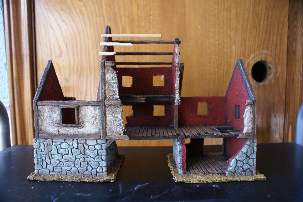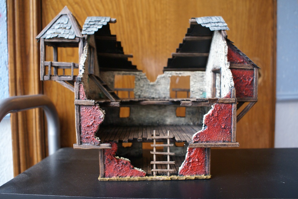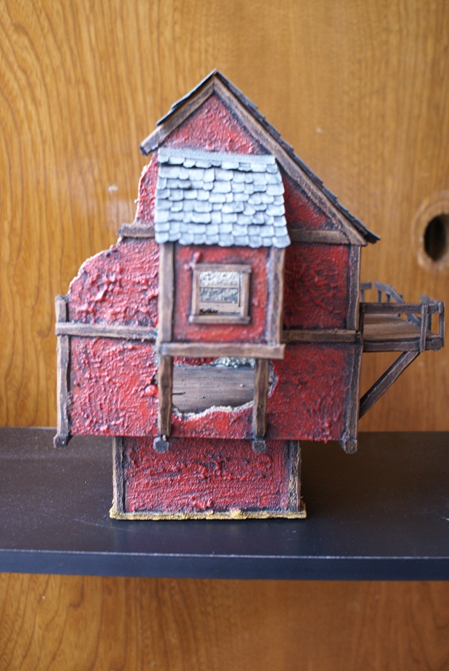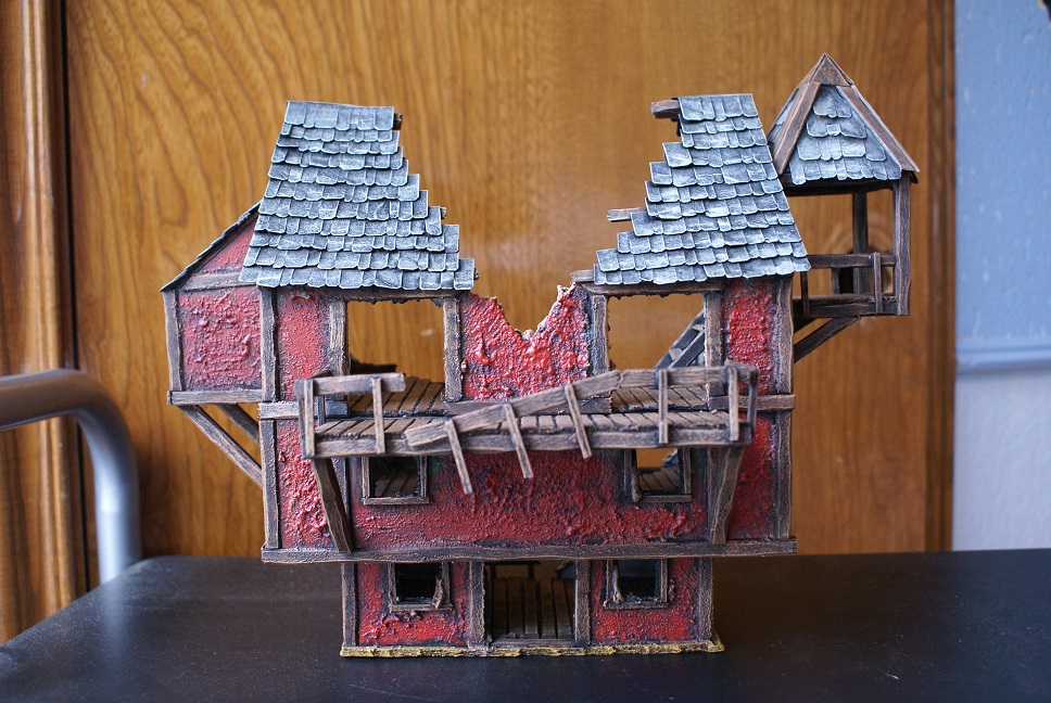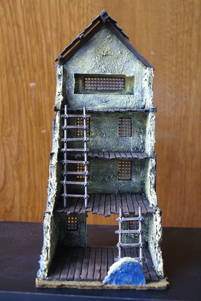 Unfortunately I didn’t take and pics of the painting in progress so I’ll have to just skip to the finished piece from here. All of the foamcore was coated with a thin layer of stucco patch with a little water added. Stucco patch is great for texturing. No sand needed, and with just a little water to thin it out, it’s ready to go right out of the container. It was base coated black, the outside was then built up with dry brushing from a very dark red to a highlight of almost fire engine red, while the inside was started with a light tan and dry brushed up to an off white. The roof tiles are thin cardboard cut into small sheets of tiles, that are trimmed to individual lengths and then bent slightly to make them look as non uniform as possible. Again, this is very labor intensive but the result is very satisfying. All wooden pieces were given a dark to light brown drybrush build up. Also, ladders made of bamboo skewers and toothpicks were added to give access to each of the floors. The final step was to give it a couple of heavy coats of clear gloss acrylic followed by a coat of matte to knock the shine down. The gloss is hard and thick so it gives the piece some protection on the tabletop.