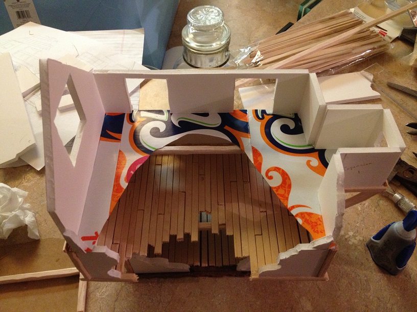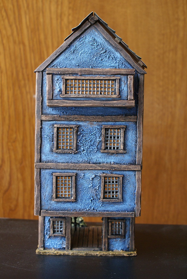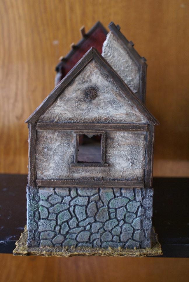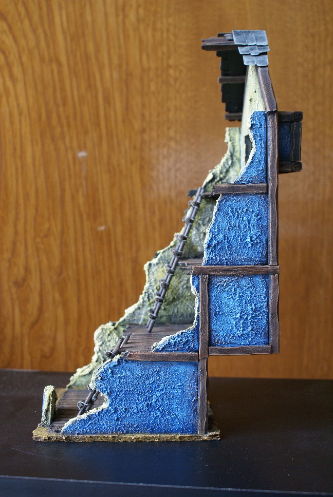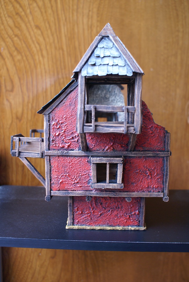 Unfortunately I didn’t take and pics of the painting in progress so I’ll have to just skip to the finished piece from here. All of the foamcore was coated with a thin layer of stucco patch with a little water added. Stucco patch is great for texturing. No sand needed, and with just a little water to thin it out, it’s ready to go right out of the container. It was base coated black, the outside was then built up with dry brushing from a very dark red to a highlight of almost fire engine red, while the inside was started with a light tan and dry brushed up to an off white. The roof tiles are thin cardboard cut into small sheets of tiles, that are trimmed to individual lengths and then bent slightly to make them look as non uniform as possible. Again, this is very labor intensive but the result is very satisfying. All wooden pieces were given a dark to light brown drybrush build up. Also, ladders made of bamboo skewers and toothpicks were added to give access to each of the floors. The final step was to give it a couple of heavy coats of clear gloss acrylic followed by a coat of matte to knock the shine down. The gloss is hard and thick so it gives the piece some protection on the tabletop.