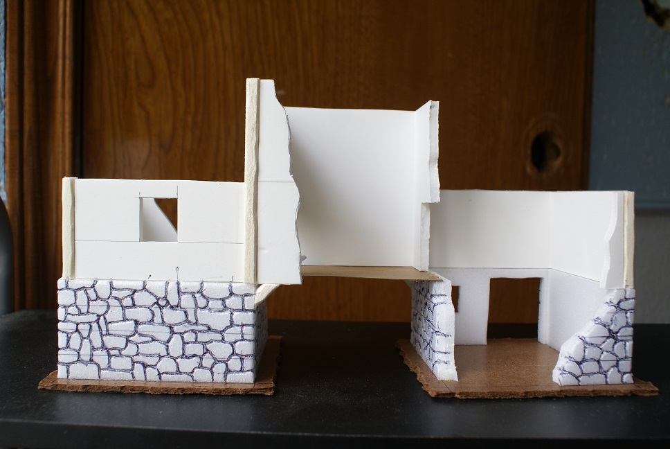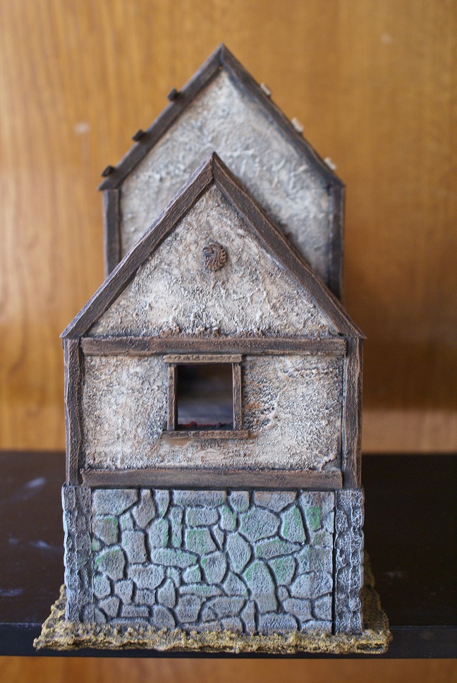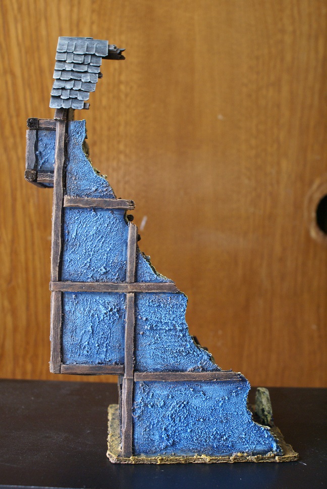 Here is the piece with the door and window frames finished out, and with the balcony railing in place. I decided to create a small gap in the railing to create a risk of falling if any minis get knocked down near the gap. Once again, risk and reward.