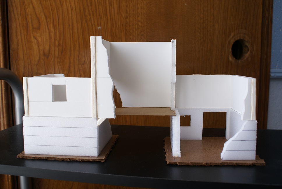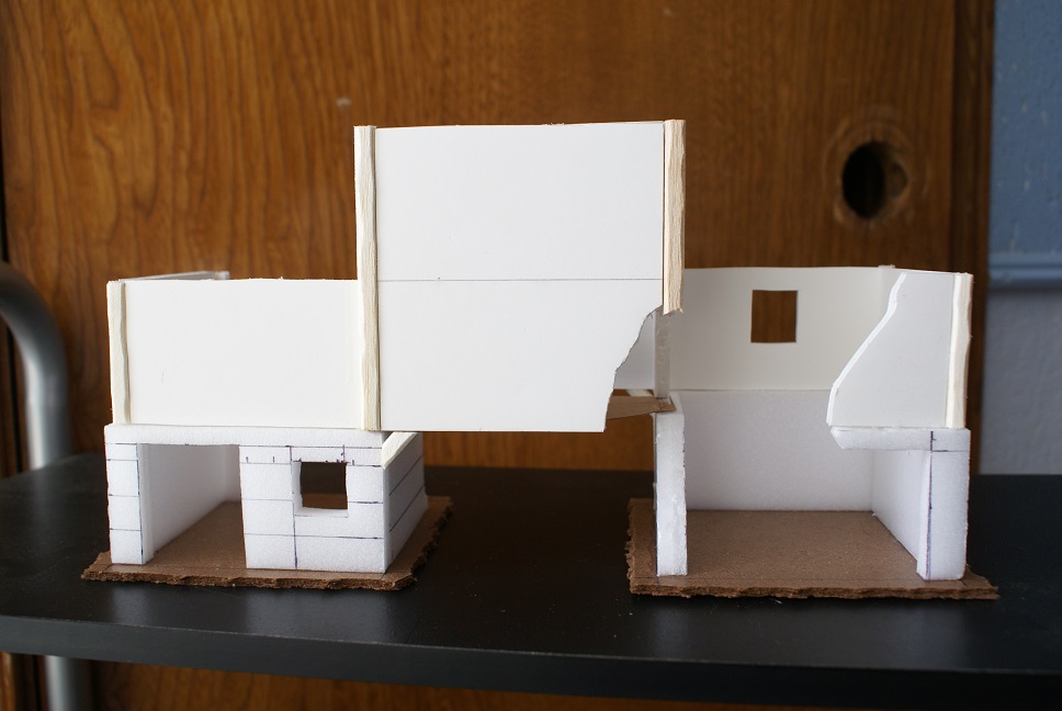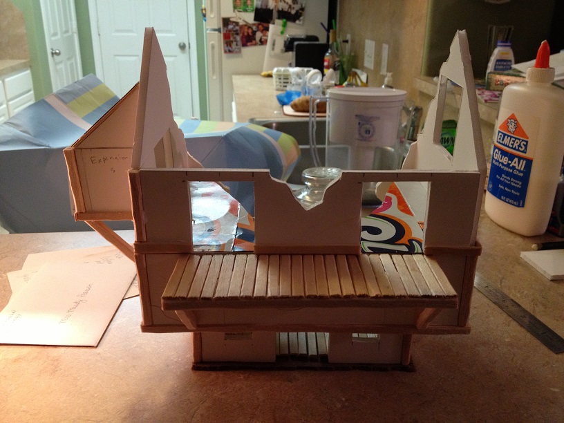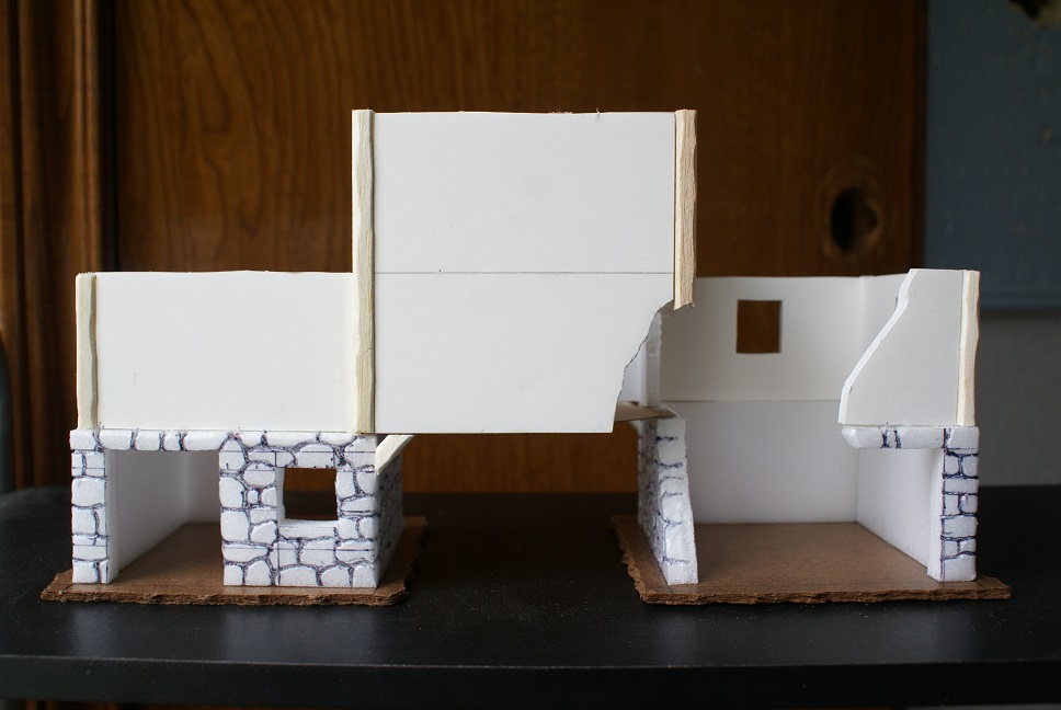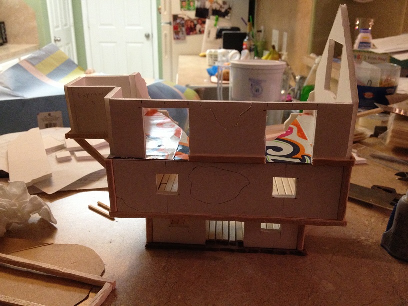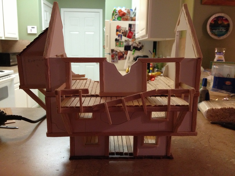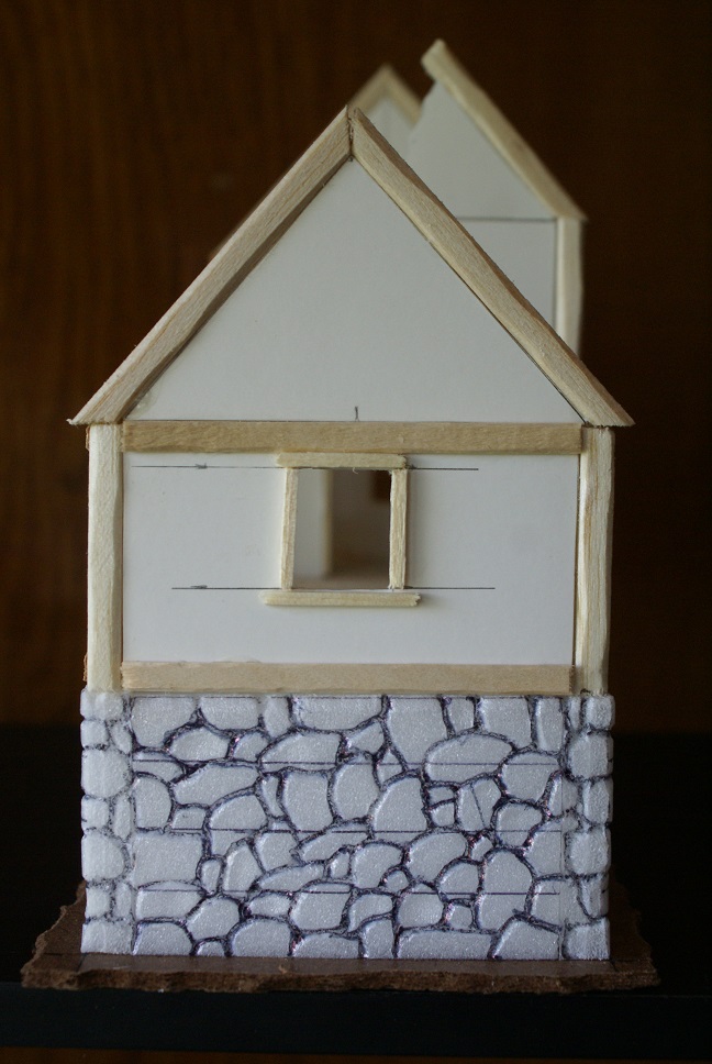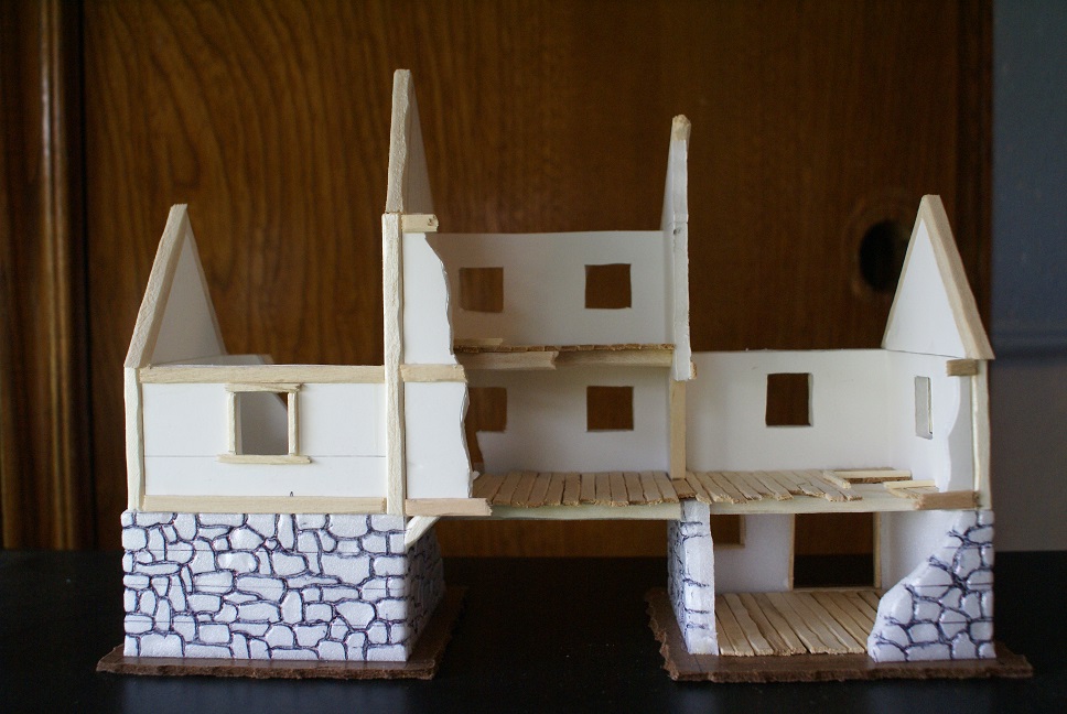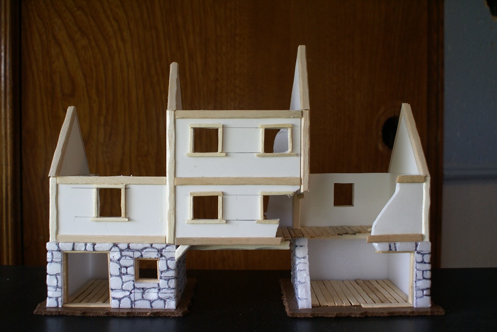 This is where I started. I decided on the dimensions of the bottom floor, then I measured and cut out a piece of hardboard a half inch(I went with one inch after this piece) longer and wider than my bottom floor. I then took a pair of pliers and carefully broke off the edges all the way around to give it a rougher, more natural look. I cut out each floor from(mostly) one piece of foamcore and made the floor boards for each floor from craft popsicle sticks. This part is really time intensive but the result can’t be beat by any other way that I have seen. I cut each stick to length and then shave down the top sides to give the sticks a slight beveled look and to really highlight the gaps between “boards” once painted. For the upper floor I first laid down a piece of thin cardboard(recycled from a soda 12 pack) in the rough shape of my floor and laid the popsicle sticks over that. Around the doors, I created door frames from more popsicle sticks, and around each window, I made window frames from square tooth picks.