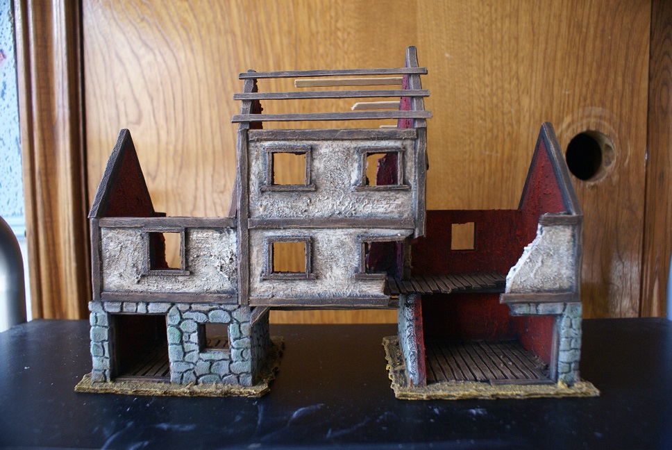This is the first piece I built for my new terrain collection. For my games, I like bigger, vertical pieces. I also like spanning several buildings with makeshift bridges so that there is no one way to get to good spots. That way, no one is ever completely safe and no one can dominate a game from a single position. This particular piece is a three story building with a small bell tower(still need to find a good bell to put in it) on the side. It’s made, primarily, of foamcore, balsa wood, thin cardboard, tooth picks, popsicle sticks, and a hardboard base.