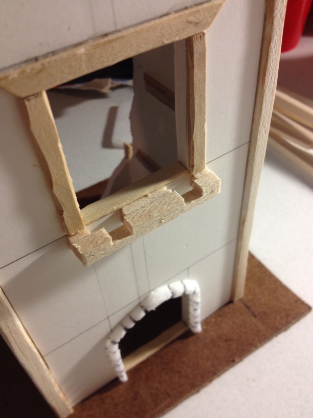 Here is a close up of the mount. Just made of balsa for now, and pinned to the wall of the building for a little extra strength.