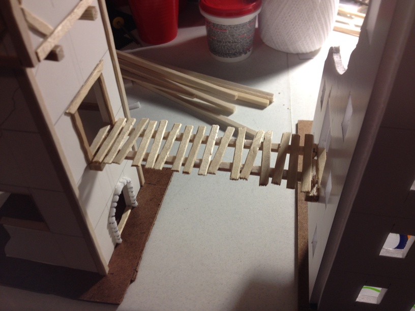 It struck me that if my bridges were all going to be modular, why couldn’t my balconies be modular as well? I could just make a small handful of balconies in various states of destruction and simply hang them by the same mounting system that the bridges use. problem solved. Below are pictures of my prototype bridge and mounts…