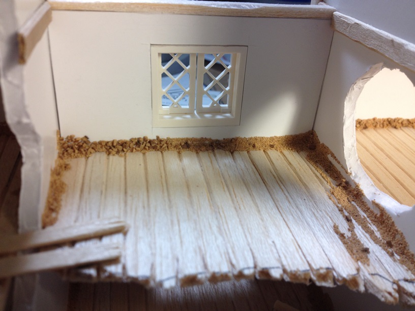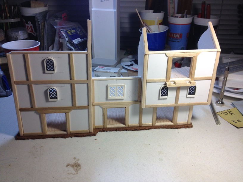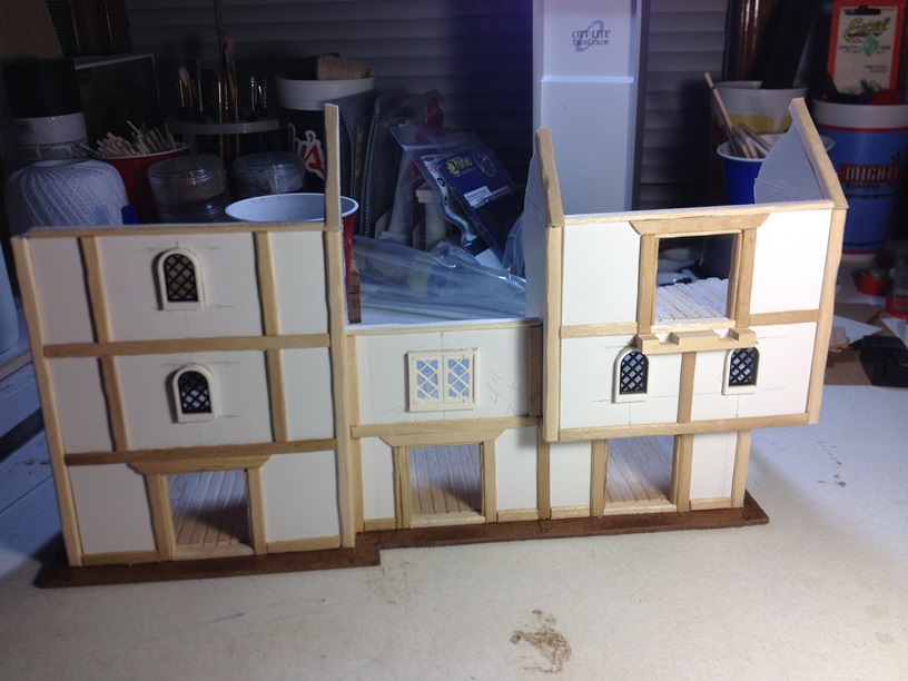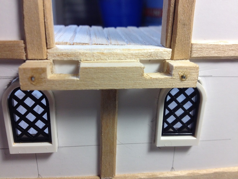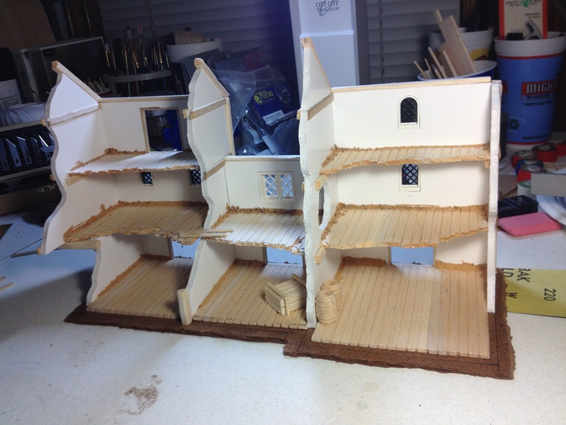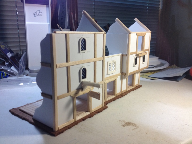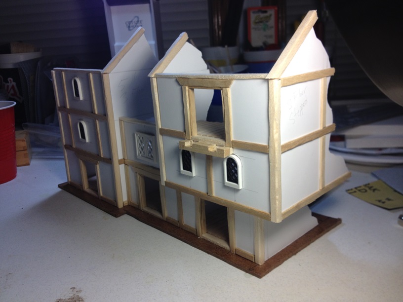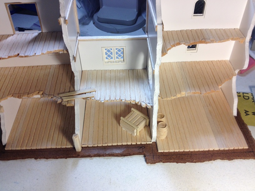 It is starting to look good, but it is still a bit bland… We REALLY want terrain to come alive to add to the atmosphere of the game, so we need to grab some balsa strips, and a hobby knife, and get to work. First we need to add some supports to the underside of the second floor of the building on the right.