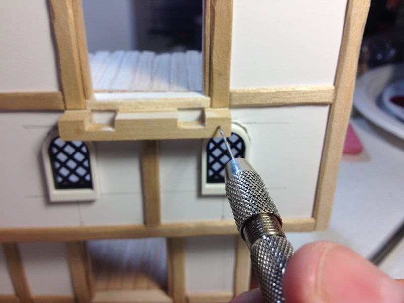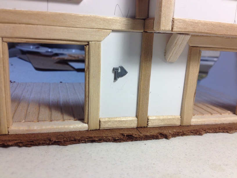 To hang the sign, we will cut a strip of 1/4 inch x 1/4 inch balsa about an inch and a half long. There are a couple of different ways to hang something like this, the way I chose to do it, was I used my pin vise drill to drill two holes in both the sign and the sign post itself. I then drilled a hole all the way through the wall, and pinned the sign post to the wall. (Sorry, no pictures.) Then I used some small string to run through all the holes, and hang the sign to the wall.