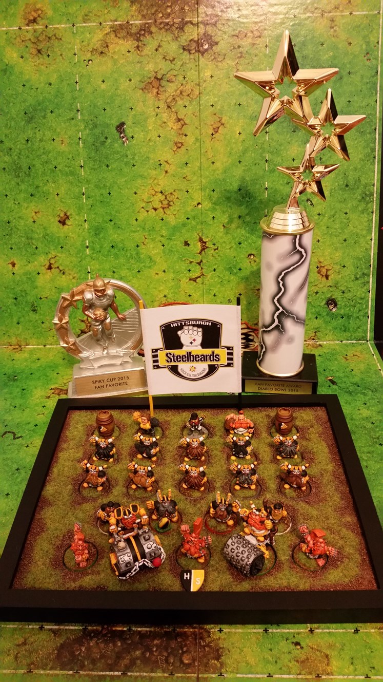 Well, my XBBL friends and I made the trip to Dallas for Diablo Bowl yesterday. It was a long, but fun day and we all had some real ups and downs. Jeff, who finished 2nd place at Orclahoma Bowl earlier this year had what was probably his worst tournament ever, and finished the day at the bottom table. James and Dave played their final games at tables 1 and 2, with James taking home 2nd place overall, and I only managed to finish in the middle of the pack with my 1-1-1 final record. The upside is that my Hittsburgh Steelbeards Dwarf team is now a TWO-TIME award winning team.