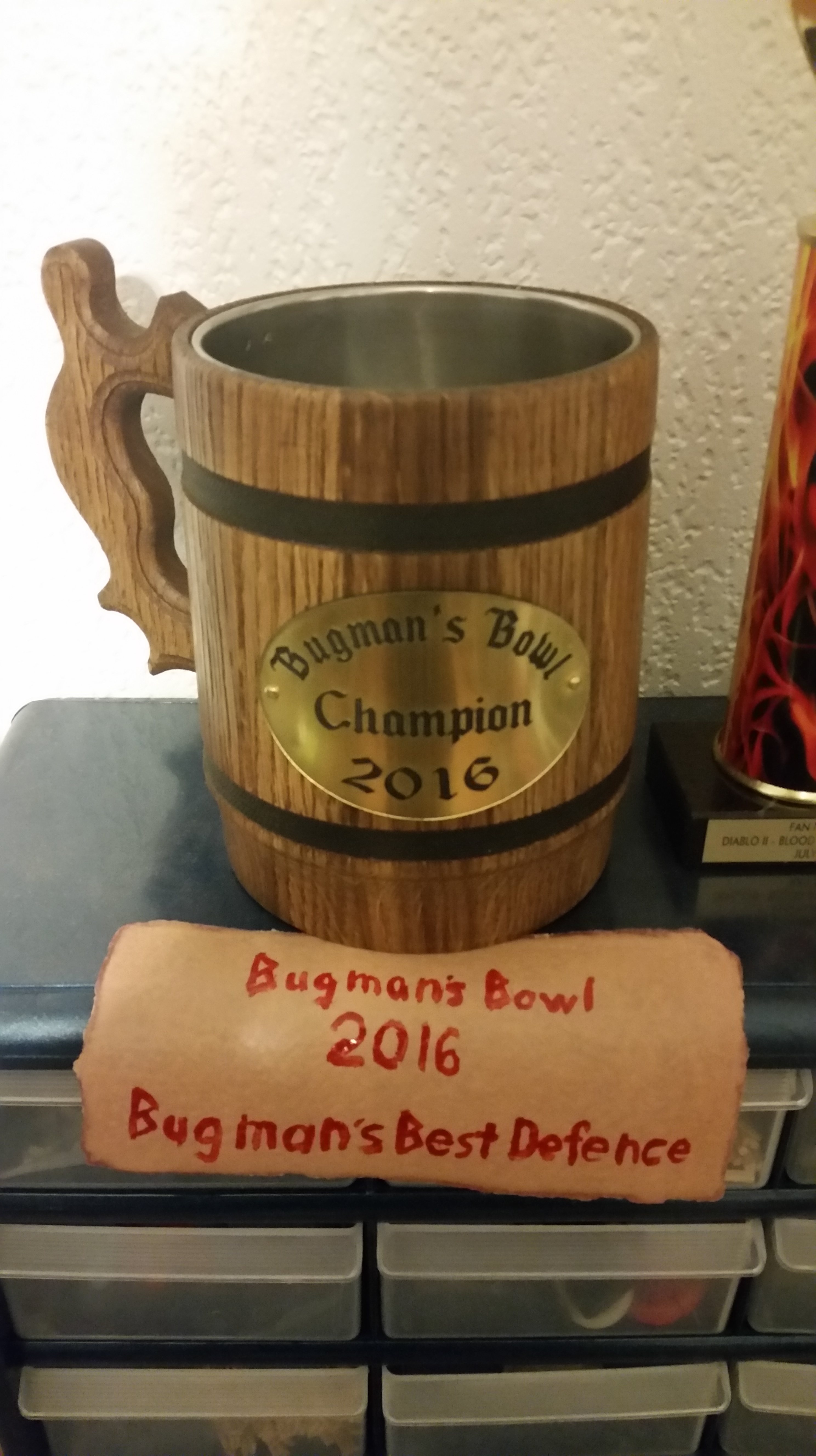 With the tournament organizer telling me that even a tie would still get me first place in the tournament, I now knew for sure that I had gotten my first ever first place finish in a tournament. I was exhausted, and my ass was killing me from sitting on those uncomfortable picnic tables all day, but I was happy. I was also happy to learn that I also won Best Defense as I had only allowed a single touchdown all day, and if it had not been for that darn Riot, it would have been no touchdowns all day. Dean, the tournament organizer actually had some really cool, and unique trophies for Bugman’s Bowl. Since Bugman’s is a beer brand, the first, second, and third place trophies were all wooden beer mugs!