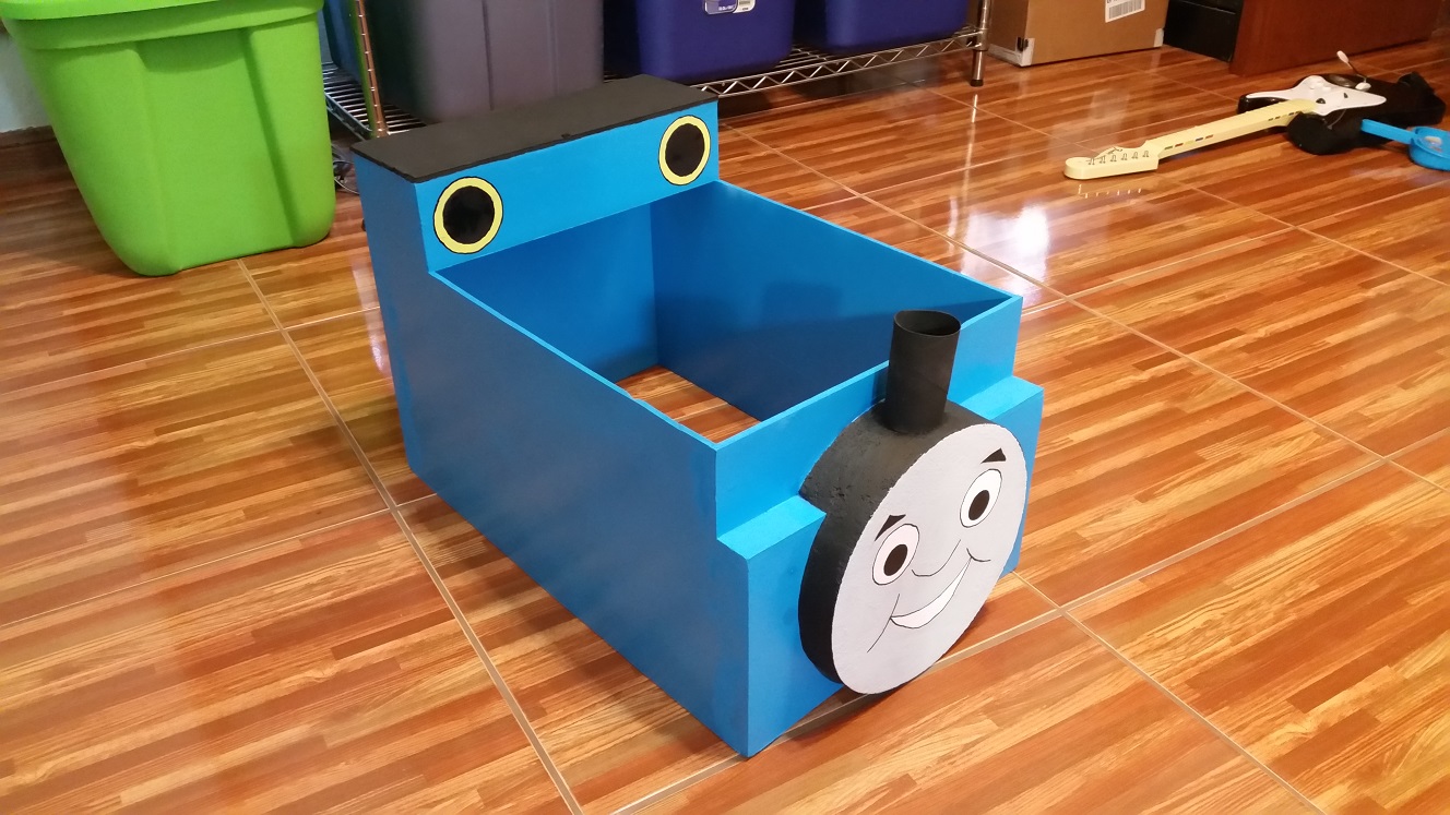 Next up was my first ever attempt at making a Halloween costume from scratch. Over the last few months, my wife and I have been asking our son what he wanted to be for Halloween. As most three and a half year olds do, he changed his answer ever time he was asked… until about a month ago. Right about then he started saying pretty consistently that he wanted to be a “choo choo train.” Well, I started looking at train costume options online, and as you might expect, there really aren’t many decent options for off-the-shelf train costumes. After looking at some homemade costumes, and going over some ideas in my head for about a week, I decided that the skills I have picked up over years of building terrain had to be transferable to making Halloween costumes. As luck would have it, I was right! Almost all the homemade train costume images I could find were Thomas the Tank Engine costumes, so I went with that so I could use the images I found as a guide.