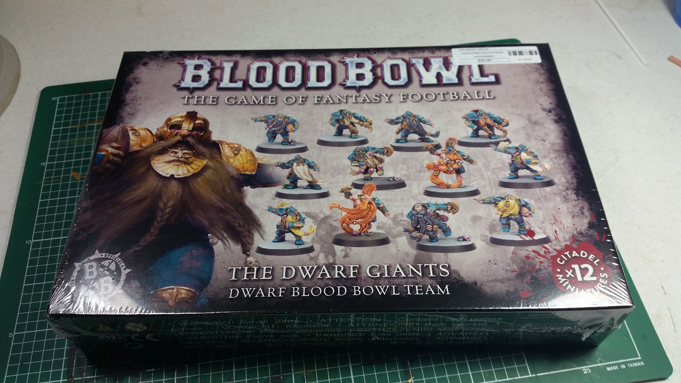 Yesterday saw the release of several new items in the Blood Bowl range, mostly centered around the new Dwarf team. There were three widely available releases and one web exclusive item. I have been pretty irritated by the number of releases that are exclusive in one way or another, but that is a topic for another post. Yesterday’s release included the Dwarf team minis (which as previously stated and shown in the pic above, I bought two copies of), the Special Play Cards: Hall of Fame pack, and the instantly sold out online Dwarf Giants Dice Set. I was lucky enough to secure a set through pre-order from my FLGS. There was also the online exclusive, and also instantly sold out, Dwarf/Skaven themed pitch and dugouts. I was lucky enough to get my online pre-order in on this before they disappeared. I will write another post and show it off once it arrives.