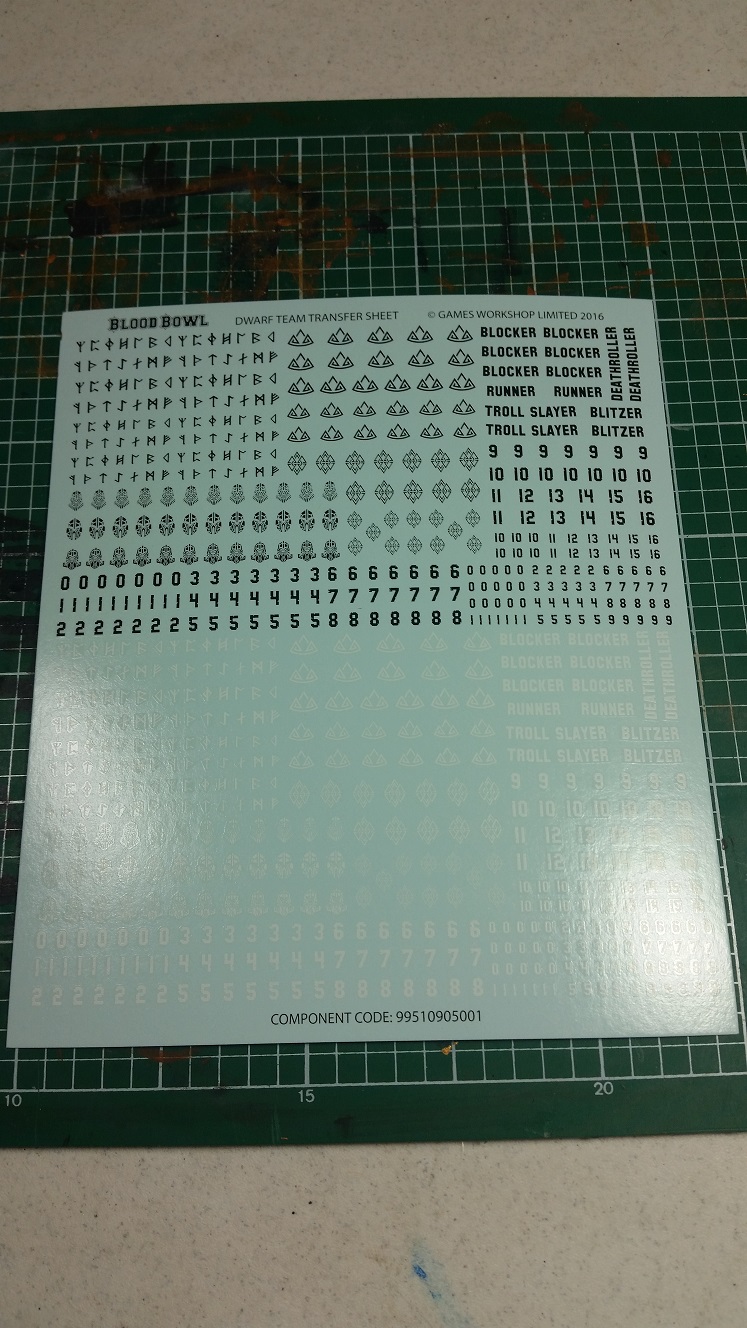 A nice group shot of everything in the box. Like the Skaven team boxes, this box contains two identical sprues of minis, counters, and footballs, a bag of 32mm slotted bases, a water slide transfer sheet of numbers and other detailing decals, and a sheet with assembly instructions. One thing the Dwarf team box includes that is a first for this release is optional heads/beards for the Blitzers and Slayers. That is a welcome addition for some added flexibility in the appearance of the minis. Additional pose sculpts for the positional players would be even nicer, but I will take what I can get.