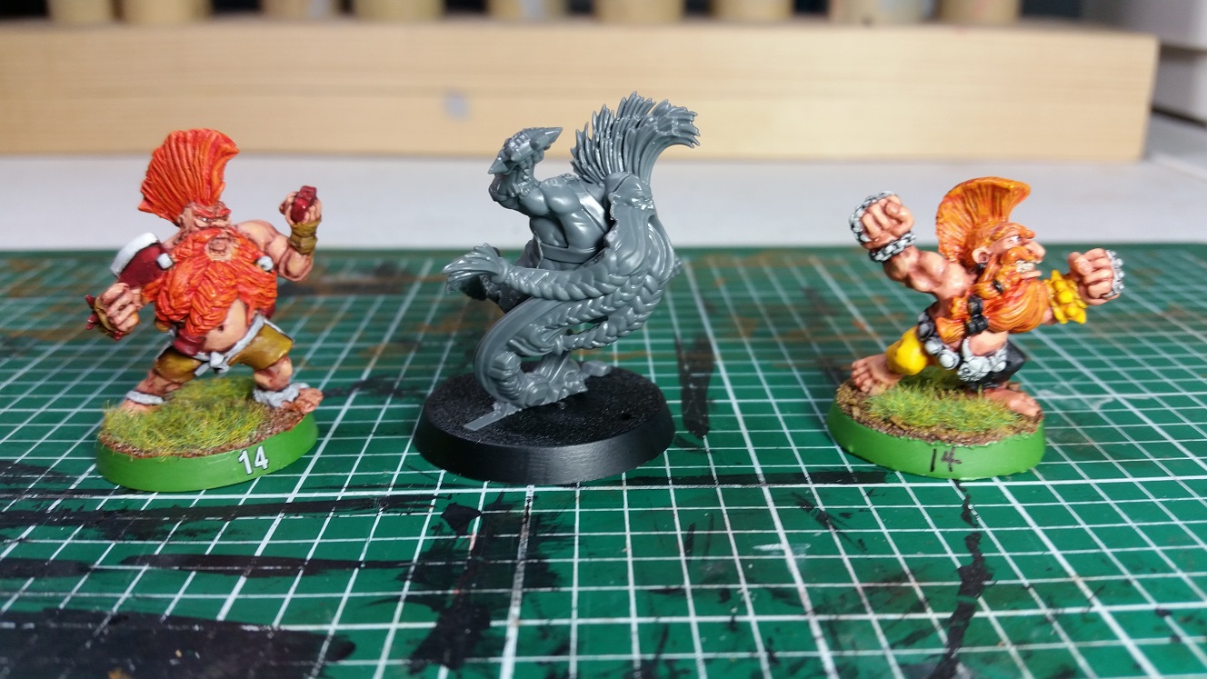 Here is the new Blitzer mini next to a 3rd edition Games Workshop Blitzer and a Blitzer mini from the somewhat recently released Iron Golems, Iron Forgers team. The new Blitzer mini is probably a little taller, but it is also sculpted in a more dynamic pose that could account for the small amount of additional height. All in all, they are very close in scale, and I think they are a nice evolution to the Dwarf team. In the interest of full disclosure, I could do without the leaping Troll Slayers, but that again is a topic for a different post.