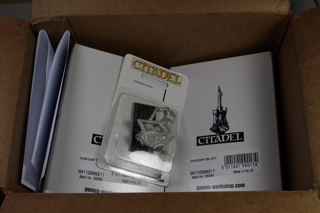 I ordered two copies of the Chaos Dwarf team. One that included the Bull Centaurs and one that did not. For some reason, the Bull Centaurs were by far the most expensive minis coming in at $25 a piece which made two of them just as expensive as entire teams of other minis. The Chaos Dwarf team without the Bull Centaurs was the same $54 price as the other teams, but the version of the team that included the Bull Centaurs was a whopping $104. Why did I get two copies of the team itself? Well, the team box only comes with four Chaos Dwarf Blockers, but you can have six on your roster, so the only way to get a full compliment of Blockers was to buy two teams and end up with a bunch of minis I did not actually need. I plan to put the extras on eBay at some point and try to recoup a little bit of the way too much money this cost me. Anyway, back to the unboxing.