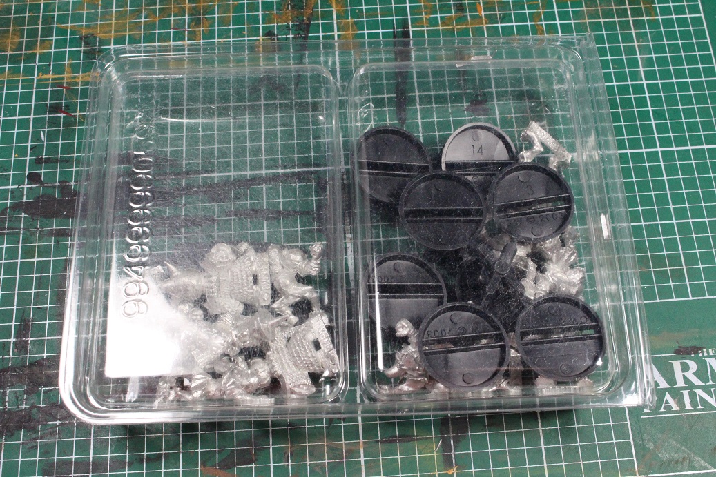 Old school Games Workshop metal minis. Yes! Games Workshop originally advertised that the minis would ship with the new 32mm slotted bases, which I was not thrilled about. The new bases can look a little big with the new larger scale minis. I was concerned that they would look even larger on the older 28mm scale minis. I am happy to report however, that the Made to Order minis shipped with the old style 25mm slotted bases. This was a very pleasant surprise to me.