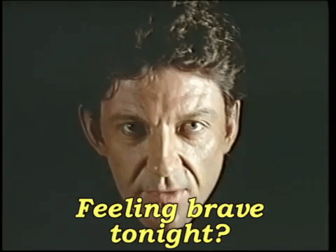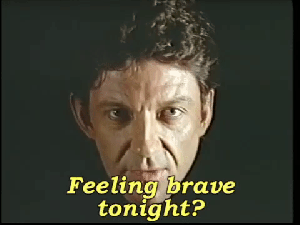 He reminds me too much of the black turtleneck wearing DM from TSR’s DragonStrike video and the sort of campy gaming photo we don’t see too much of anymore. Feeling brave, indeed.