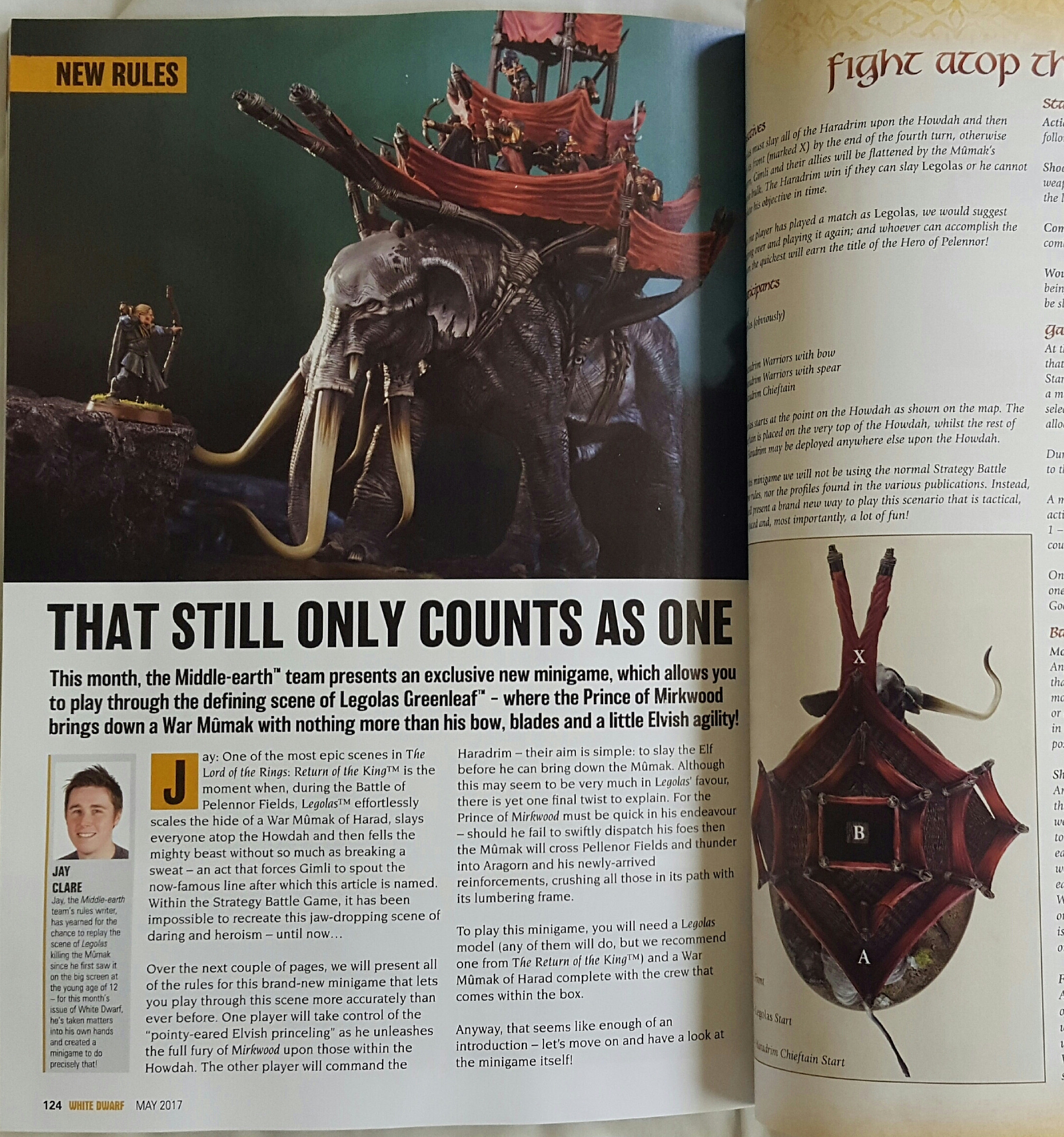 The Hobbit/Lord of the Rings – The adventures in Middle Earth continue this month with a mini game by Jay Clare featuring Legolas squaring up against a War Mumak in a rematch from their Return of the King scene. The rules depart from the standard battle game using unique stats and actions designed specifically for this encounter. Looks like a great game to try out while waiting for other members of the club to arrive.