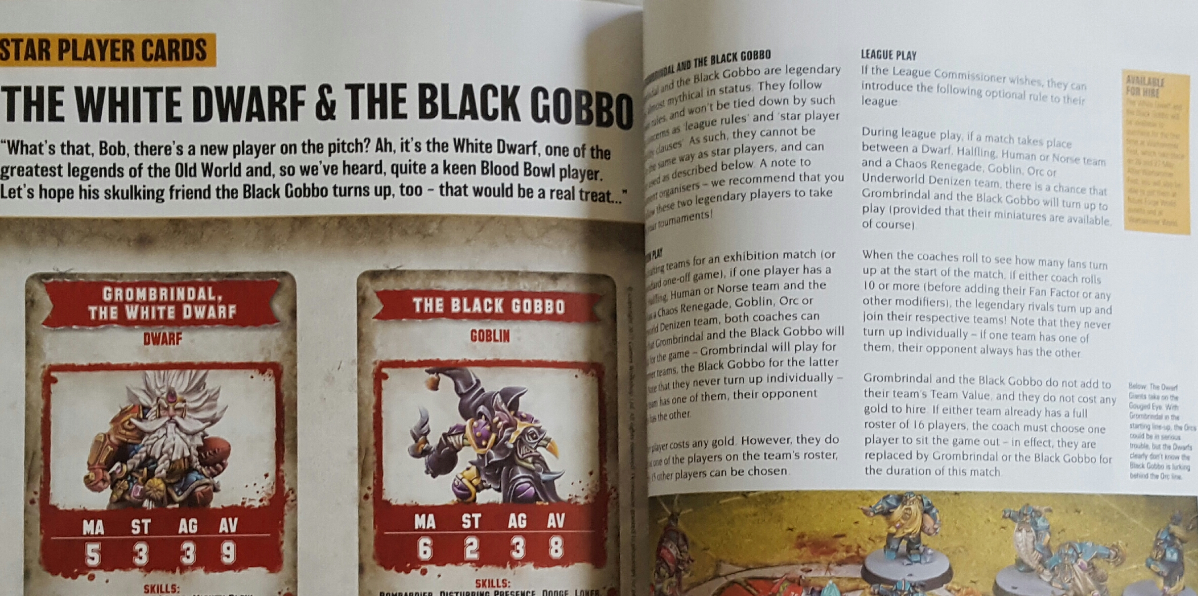 This is followed up by stats and rules for Grombrindal and the Black Gobbo. These are great models. Probably my favorite of the new line outside of the new Griff. Fortunately, they’ve also got some fantastic rules too. The pair have pretty much been designed for fun, league play only showing up on opposite teams as an event of sorts, when a match is made of a side that Grombrindal will play for and their opponent can field the dastardly Black Gobbo. This is a great idea to have the rivals pop up in your league,so they can carry on their grudge without impacting the normal inducement system. There’s a note warning tourney organizers that this pair probably isn’t best for Tournaments, and I agree. No cost is listed for either, as again, their participation is story driven and not General Manager/Coach managed.