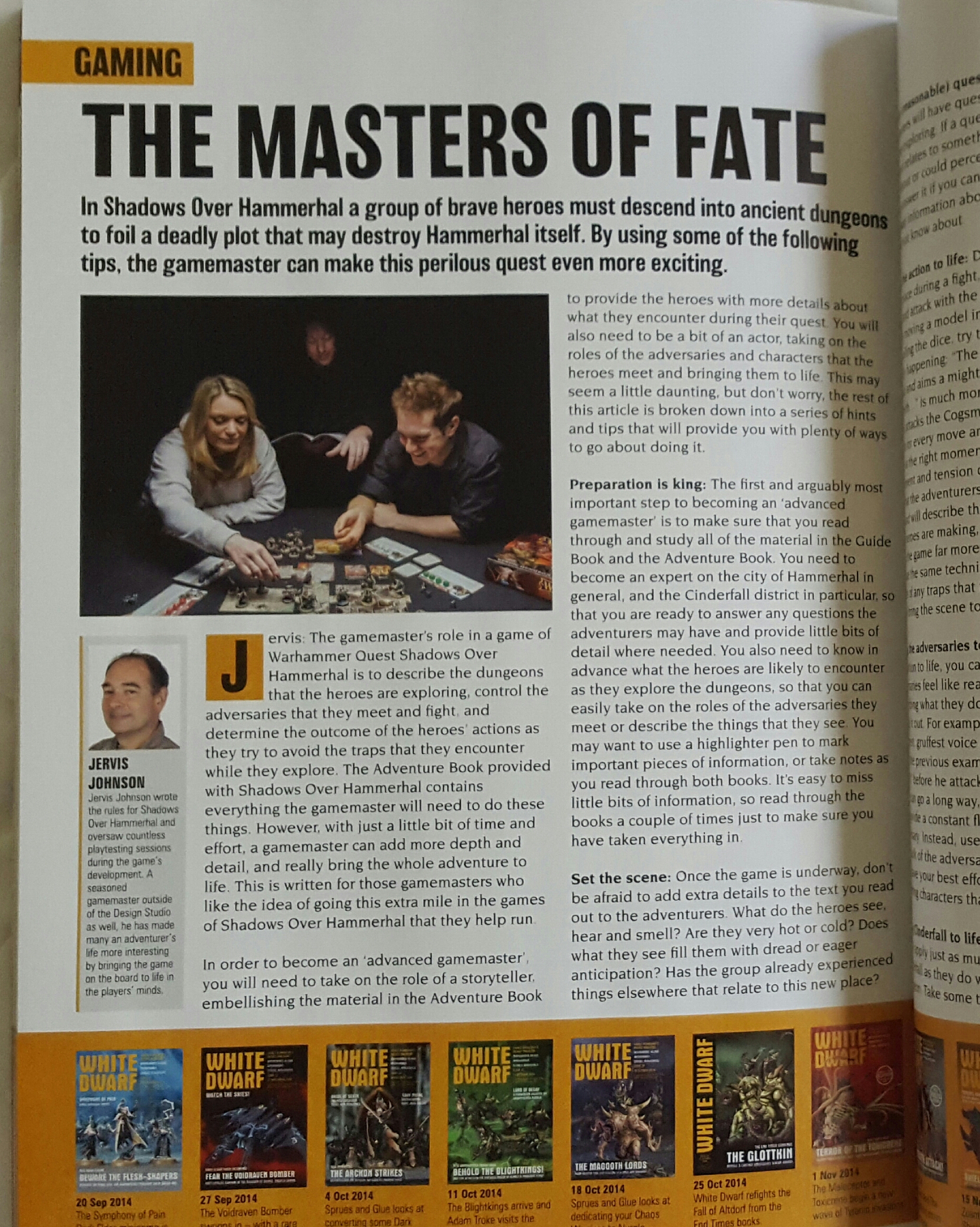 Warhammer Quest – Two bits for those of us adventuring in the new Age of Sigmar. First up are words of advice from Jervis Johnson on how to enhance the mood of your Warhammer Quest games. Standard, solid advice, but I had to get a chuckle out of the all black wearing GM floating around the background of the article’s picture.