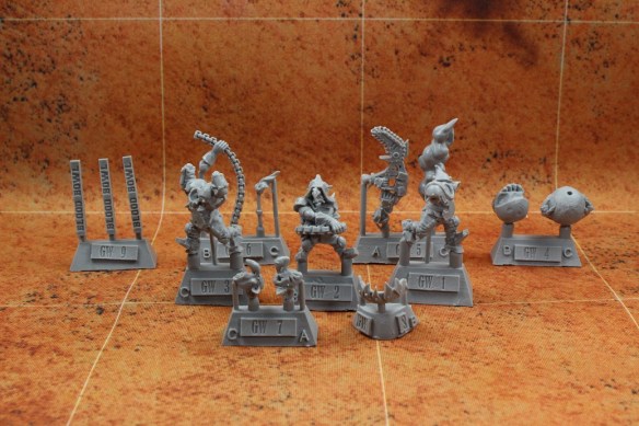 Here are all the different pieces for the minis. Note the pieces on the far left… Remember the Grim Ironjaw unboxing where I pointed out the fact that Forge World made a really strange decision by including base tabs that were completely separate from the rest of the mini… yeah, those three pieces on the far left are more detached base tabs. Now, I have to admit that the only thing I have ever ordered from Forge World are the recent Blood Bowl releases, so this may be something that they have been doing for a while and I just have not seen it before. It still completely perplexes me as I do not see the point of a base tab that is not attached…
