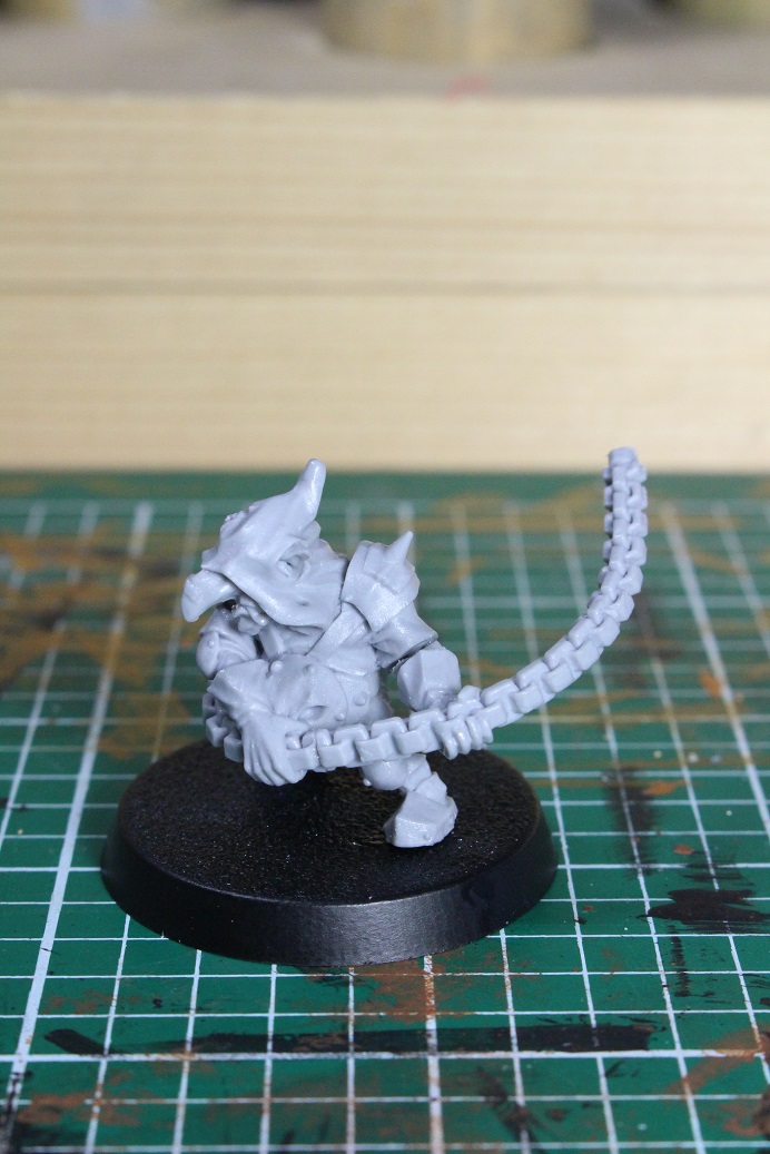 Attaching the chain and left arm was probably the most challenging part of this build. The angle of the pieces was not QUITE right, so I had to hold the pieces together in a slightly bent position until the glue dried enough to not pop out at a weird angle. There was also a little bit of a seam on the left arm, but some green stuff will fix that.