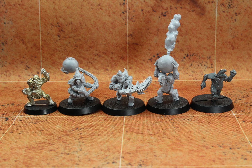 Here are the Secret Weapon minis next to a current Goblin and a 3rd edition Goblin. As you can see, they are mostly the same size, with the 3rd edition Goblin only slightly smaller than the rest.