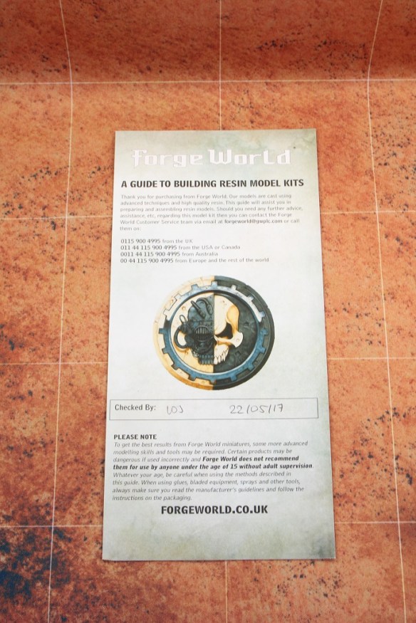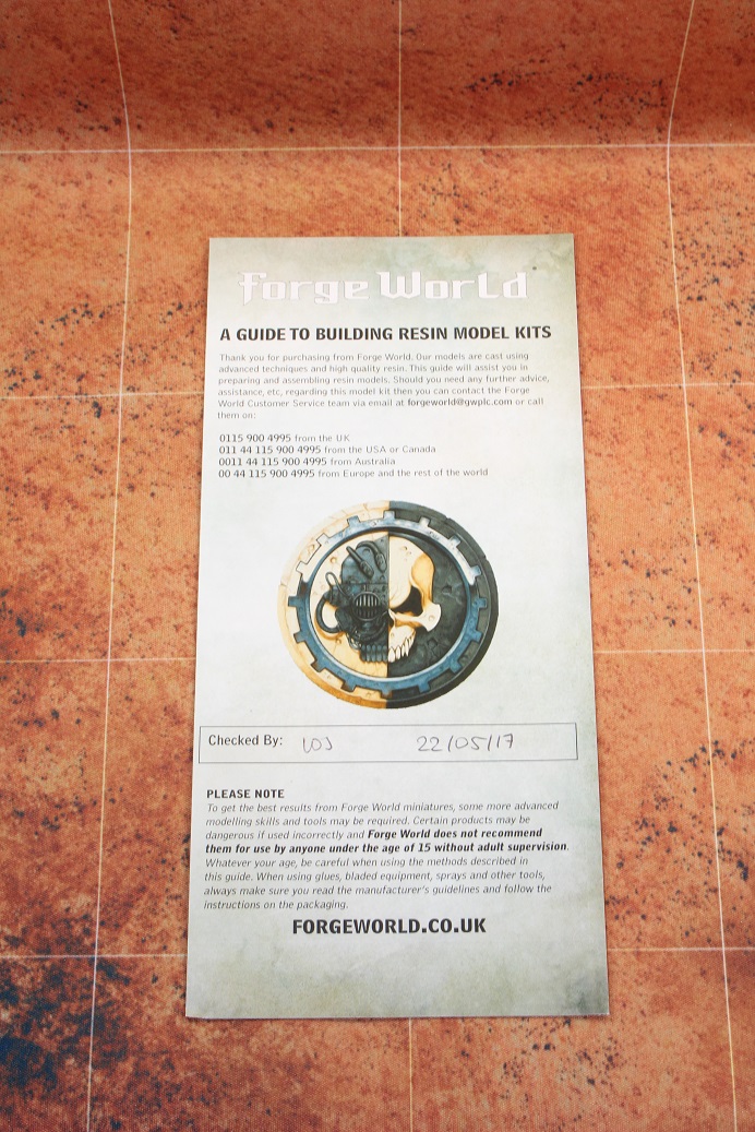 Like other Forge World boxes, you get the standard Guide to Building Resin Model Kits pamphlet.