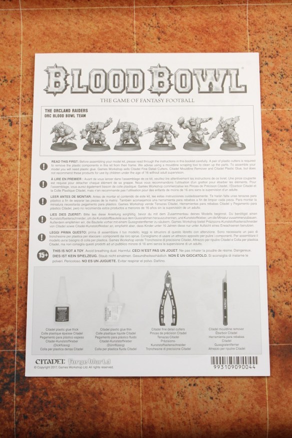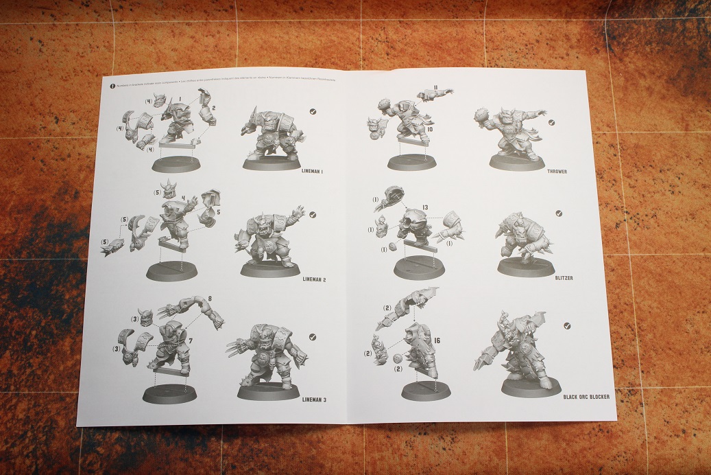 Opening the insert shows you the assembly instructions for the minis. Like the standard Orc team, the new Orcland Raiders come with two copies of six individual sculpts. Three different linemen, and one each of the Black Orcs, Blitzers, and Throwers. As others have said before, I would have been happier with more repeated Lineman sculpts and fewer repeated positional sculpts, but I digress.