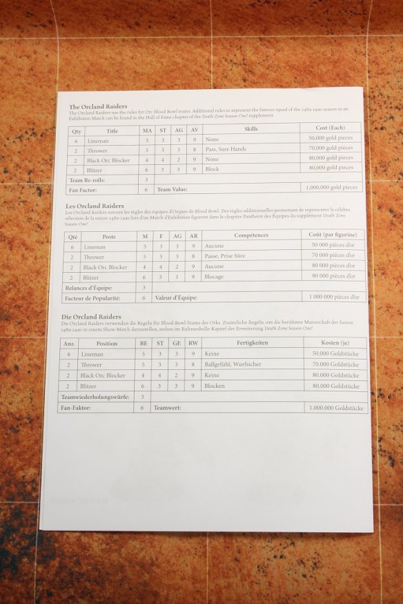 The last page of the insert has roster building information. Note that the Orcland Raider roster building information is exactly the same as the previously released Orc team roster information.