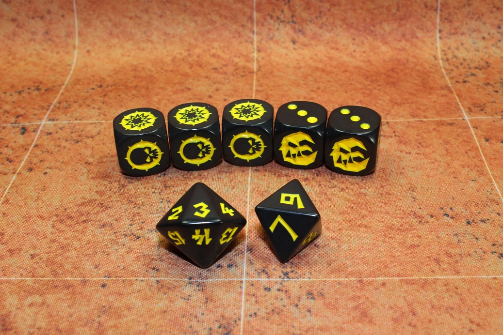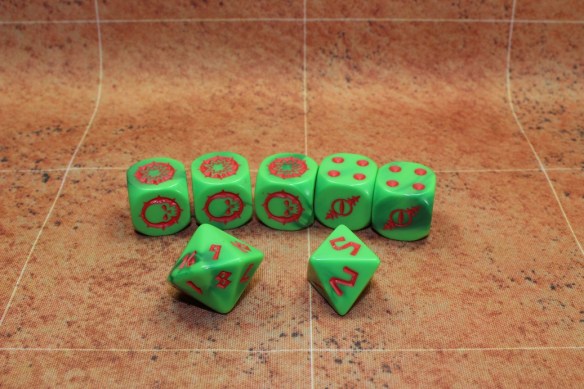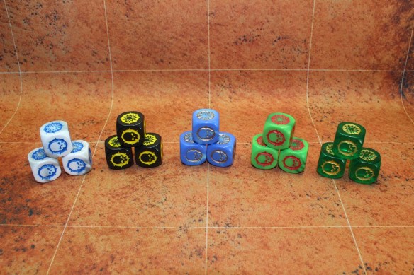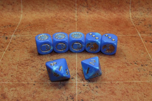 On to the dice! There isn’t really a whole lot to say about dice, so this will be a relatively short post. All the dice sets come with three Block dice, two D6’s. one D8, and one D16.