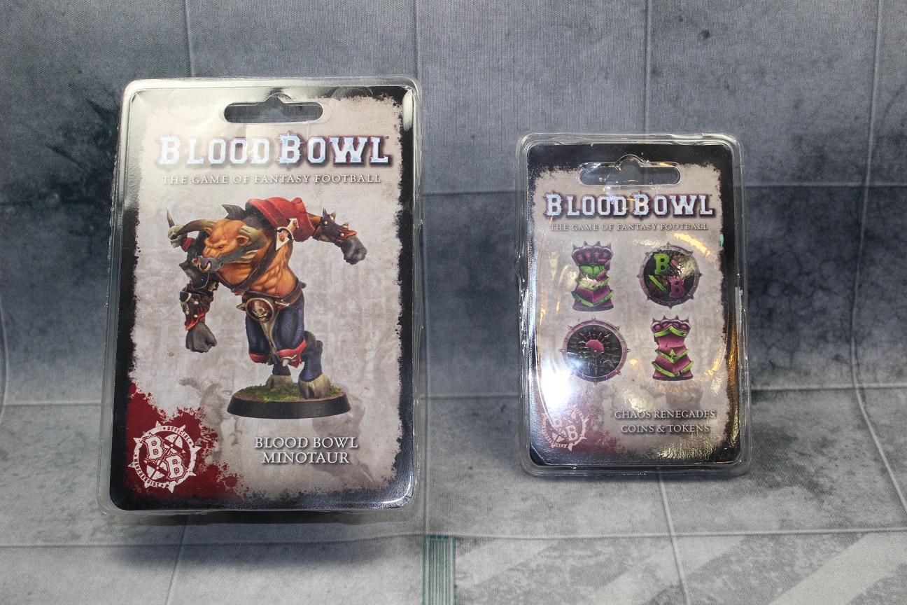 Due to the Games Workshop’s change from resin teams to plastic, it might still be a little while before the Elf Union team hits shelves. Luckily, in the meantime, we’re still getting fairly regular releases for Blood Bowl. Recently Forge World put the Chaos Renegades Coins & Tokens set and the rookie Minotaur up for pre-order, and today, a box from the UK showed up in my mailbox!
