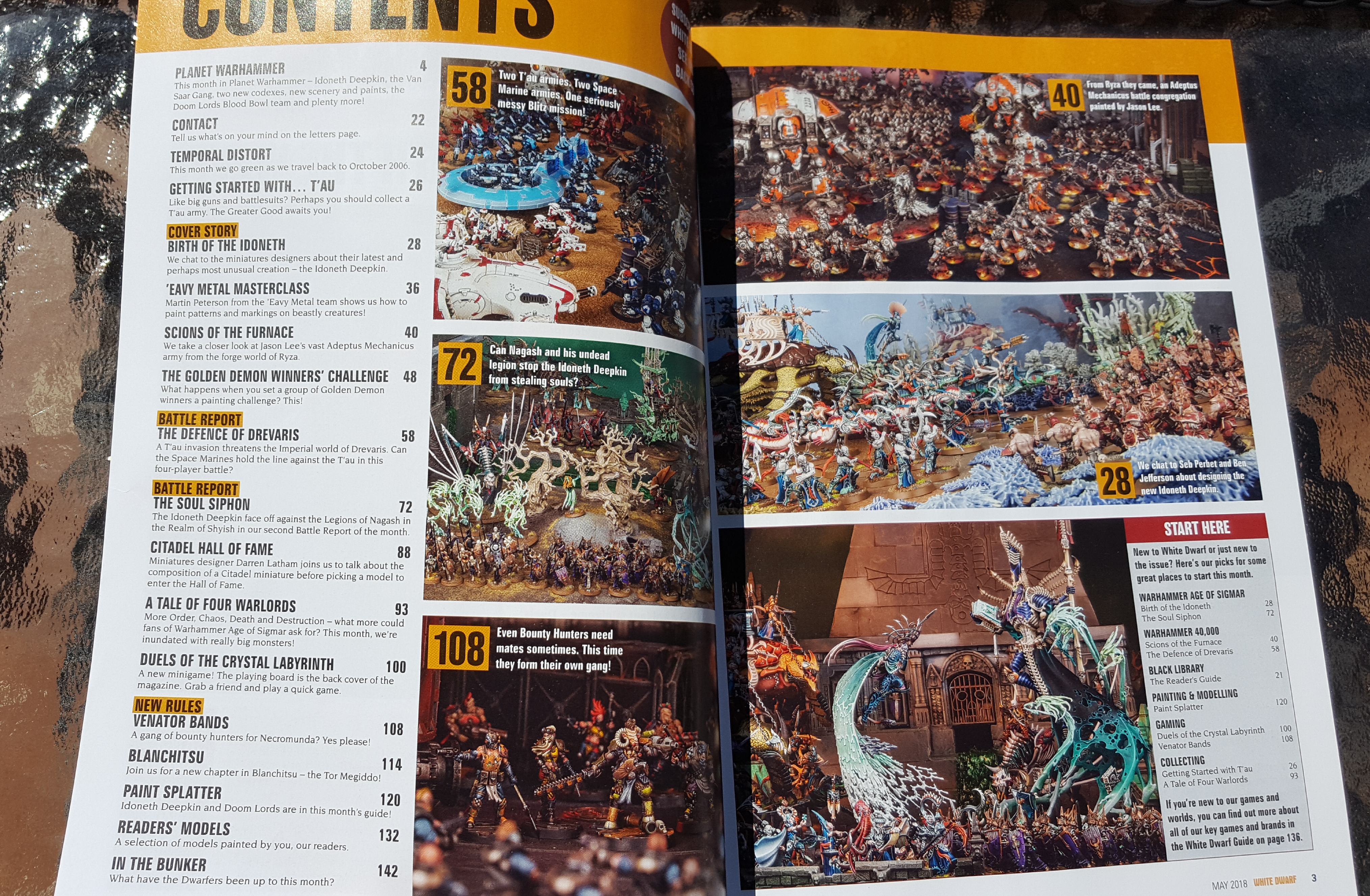A quick rundown on what true believers can expect from the May 2018 issue of Games Workshop’s house organ (includes a free game!).