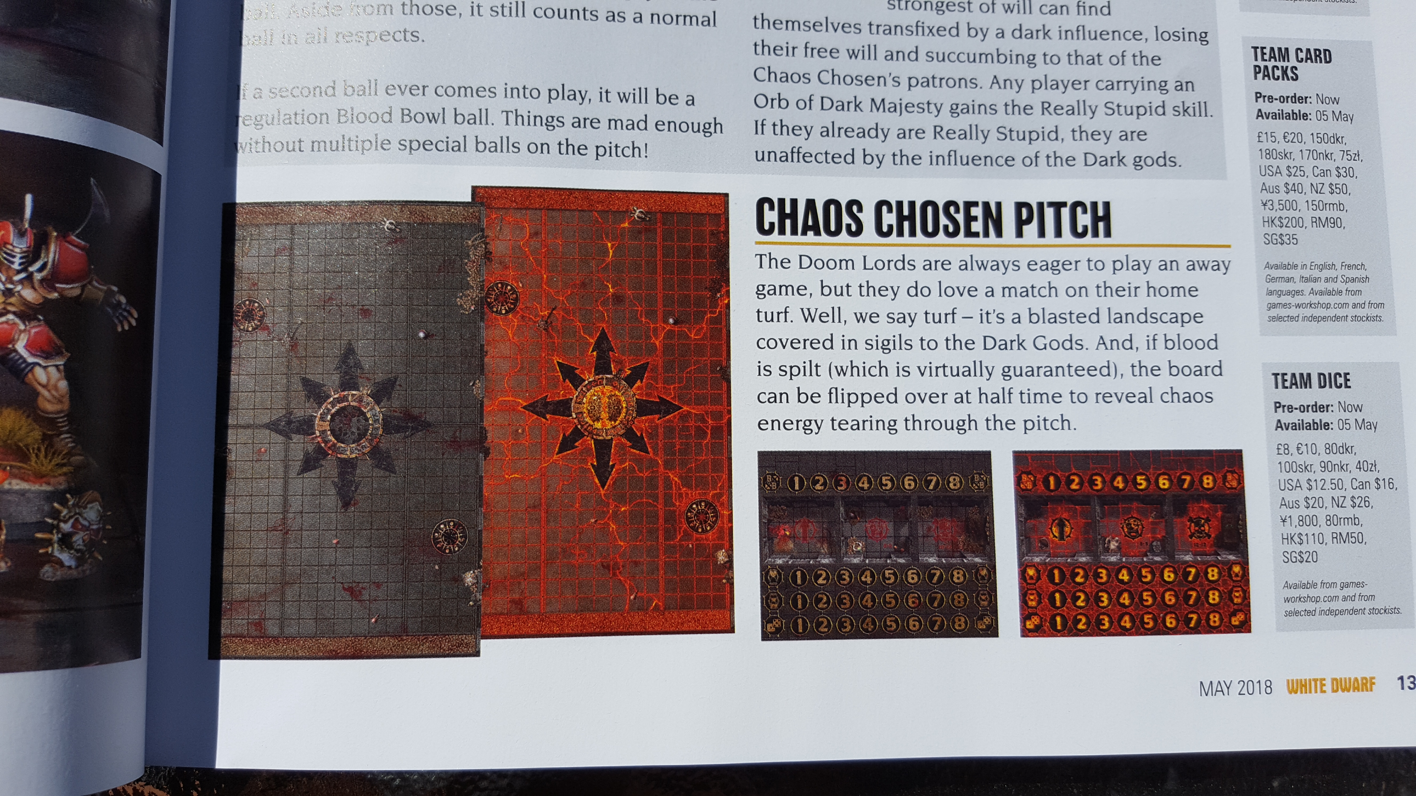 To go along with the recent Chaos Chosen Blood Bowl release, we have a chaos pitch on the horizon. There weren’t any rules for Chaos Chosen pitches in Spike! 01, so I assume the rules will be included with the pitch. Like the Chaos ball rules in this issue of WD, including the rules in Spike! 01 would have been nice to have all the Chaos bits in one place, but…now we have more reason to buy the pitch I suppose…