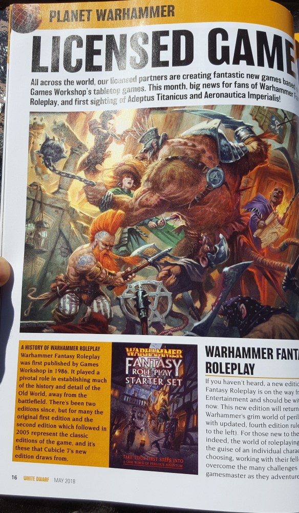 We’ve got our first mention of the new Warhammer Fantasy Roleplay in a White Dwarf (I believe). This will be the 4th iteration of the game. From what I understand the rule-set, from Cubicle 7, will call back to the beloved 1st and 2nd editions of the game. WFRP 2nd ed was my favorite fantasy role-playing system even if set after the maligned Storm of Chaos Warhammer Fantasty campaign where chaos and skaven were more known and in the open. With the Old World now officially destroyed by Archeon during the End Times, I’m not exactly sure when in the Old World’s timeline this new version will take place. I do like the nod to the cover of the 1e book though.