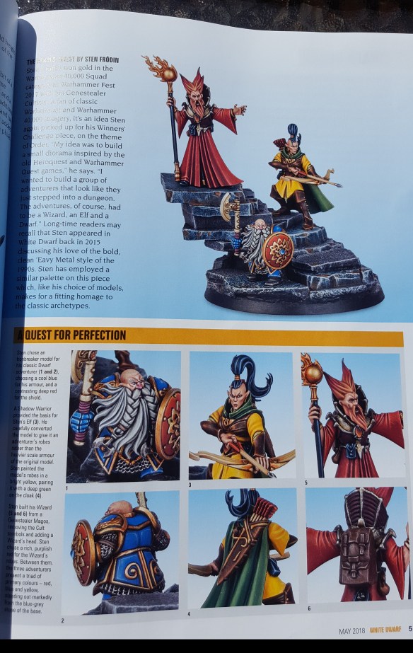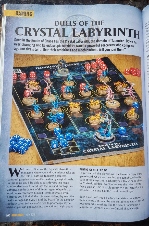 This issue has a free mini game of two sorcerers of Tzeentch dueling it out in the Crystal Labyrinth. The back of the magazine doubles as one player’s half of the game board, so you’ll either need a second copy of the magazine, or print out a copy of the back to run both spellslingers. I’ve got a handful of Tzeentch sorcerers, but not enough horrors, atm. I may proxy horrors with tokens to get a feel for the game…if my son and I can pull ourselves away from Pokemon and Shadespire. Still, a ‘free’ game is a nice add.