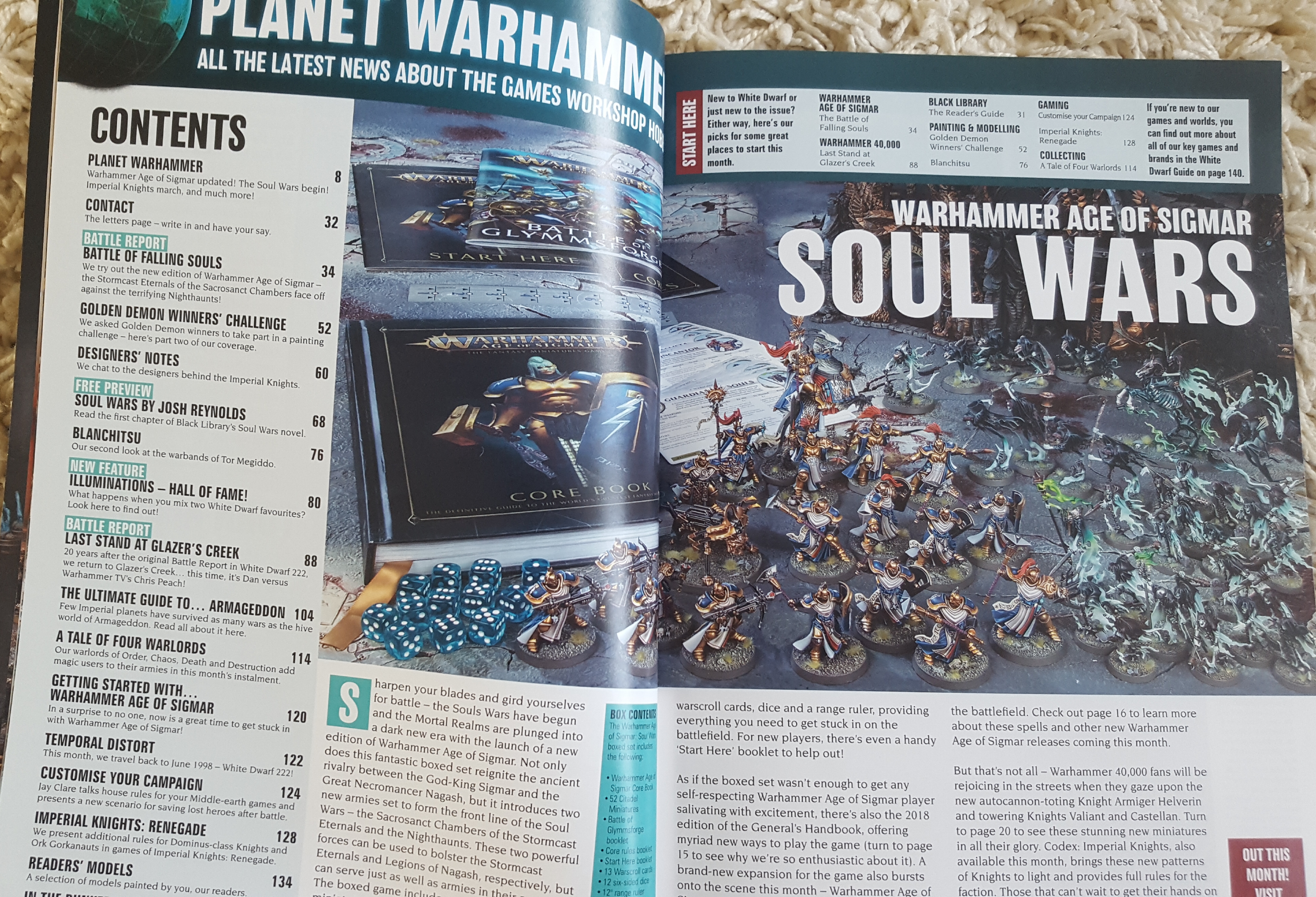 Truth be told, even as an AoS player, this was probably one of the less useful issues of White Dwarf since the soft reboot back in September 2016. Plenty of images on the new AoS and Imperial Knight models, it had a bit of an advertisement feel. It is to be expected though with a release as important as a new edition of one of their two core lines. It does appear that GW is focusing more on the background and fluff of the Mortal Realms this time, and there is a neat little feature at the beginning summarizing what’s going on on each. The new models are gorgeous, but even more than that I find the cover of the new starter box and the core rulebook to be some of the most striking cover work GW has done to date. They are simple, yet evocative. Very well done!