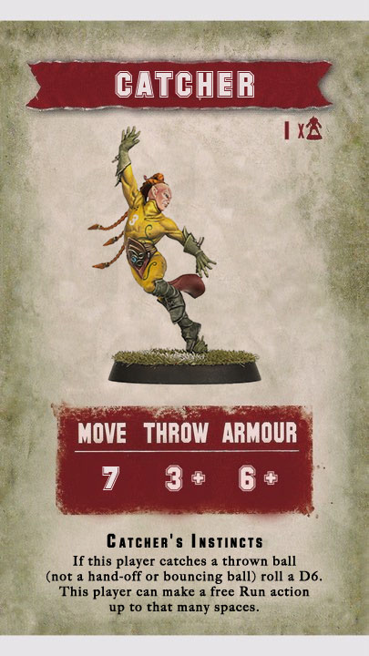 The Lineman, Thrower, and Catcher are similar to the two official elf offerings, but they have some speed on the Catcher, but a bit weaker armour overall. 6+ on the catcher as their Blood Bowl counterparts are ST 2, but alas ST is not a stat in this game.