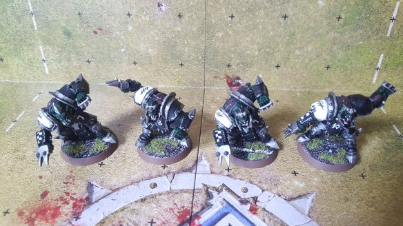 Knowing I needed something to go there, as plain white was too…plain, I leaned into their name and the other GW game of fantasy football….Blitz Bowl. The team’s new fluff is that in order to play for the Badlands Blitz an inspiring orc has to cause at least five casualties in the Blitz Bowl Arena….one casualty for each finger of a fist. Each casualty scrawled on the players shoulder pad for opponents to fear. These sort of tally marks I can handle and they don’t give the team a polished look that a transfer might.