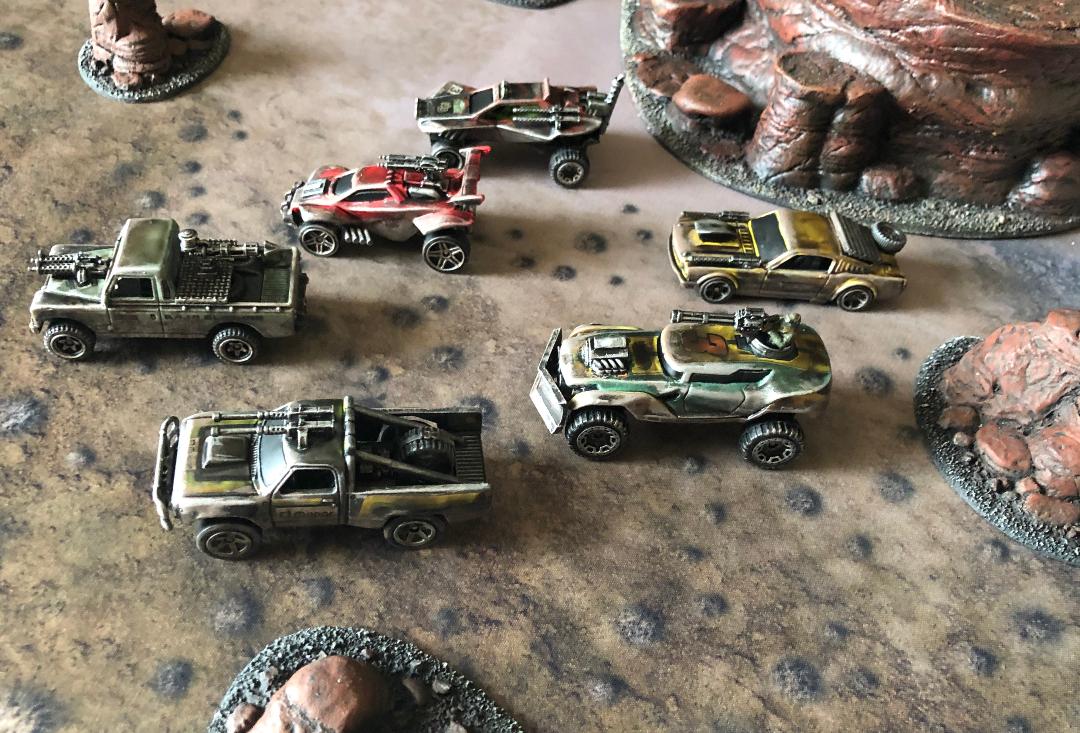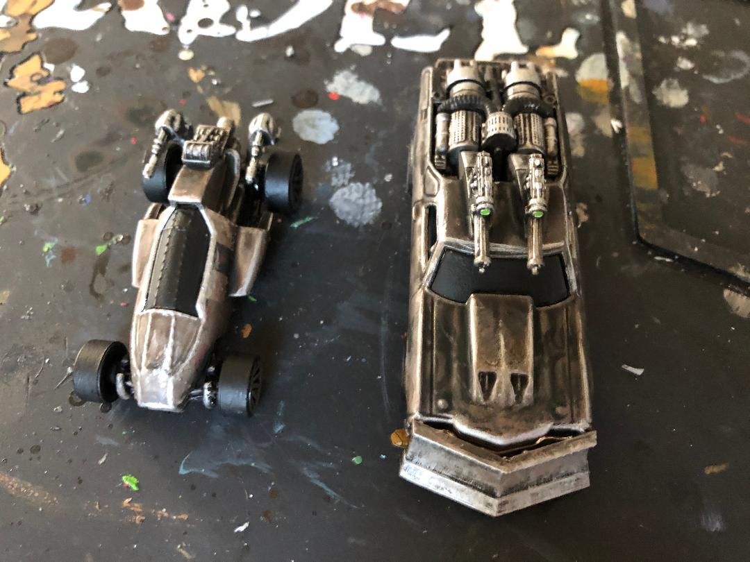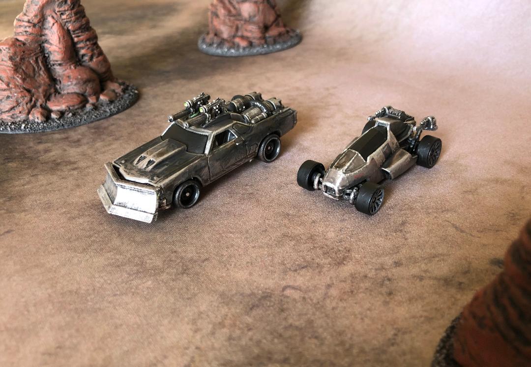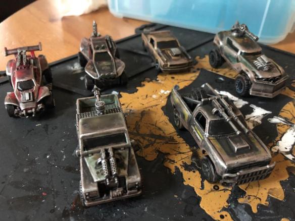 Some dark, then light brown dry-brushing on the bottom third of the vehicle followed with some steel dry brushed on the guns and along the edges and these cars were just about ready to test their mettle on the Gaslands.