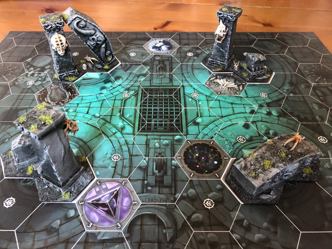 Living in the US, I went ahead and picked up the limited release, beginner friendly version of Warhammer Underworld, Dreadfane. Its board is on the Nightvault end of the spectrum, but I thought it quite possible that I would want to play on the simplicity of the Dreadfane board (single board with objectives printed on), so went ahead and cobbled together some terrain from the older Arcane Ruins set from Citadel. I hung some creature heads on the wall to represent maybe some of the creatures who died fighting long ago against the wicked creations of the Katophranes in the dreaded Dreadfane arena.
