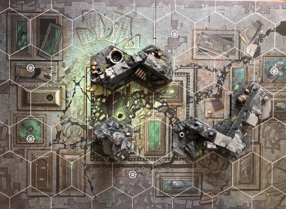 I’m not a fan of the Nightvault boards at all…so I bought extra sets of the Shadespire cardboard and those are the areas I set my games of Underworlds around. What follows is simply a series of blocked hex terrain pieces I picked up from the Hexy Store under the ‘Shadowpike‘ line. A front shot, followed by a bird’s eye view of the sets.