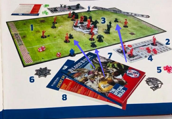 On to the box contents… From the leaked image it is difficult to make out much detail, but I will comment on what I can see, and what I can reasonably guess at. Overall, the BB2020 boxed set contents look very similar to the BB2016 contents. It appears that we get two teams, a pitch, two dugouts, two sets of dice, rules, “Cheat Sheet” quick reference cards, and passing/scatter templates.