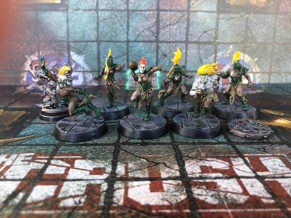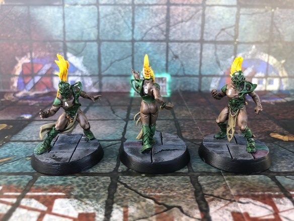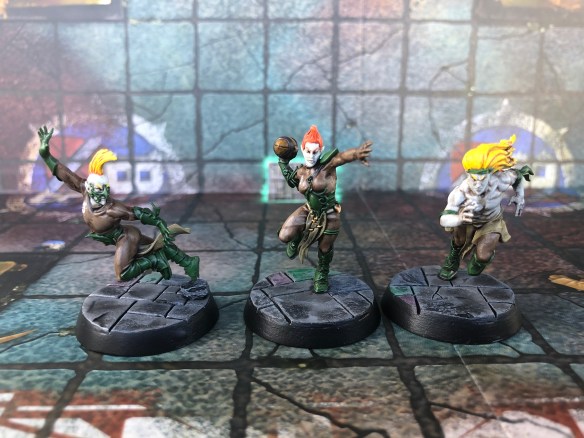 Well, all bright yellow hair except for one. I really liked the cropped mohawk head on the sprue for the female thrower and thought I’d give a nod to the badass Annie Lennox, so fiery orange hair she has. Yeah, no elf in the cartoon has orange hair, and going yellow across the whole team may have been better for team cohesion, but I’m not setting out to recreate anything, but just use influences to inspire my little corner of the Blood Bowl universe.