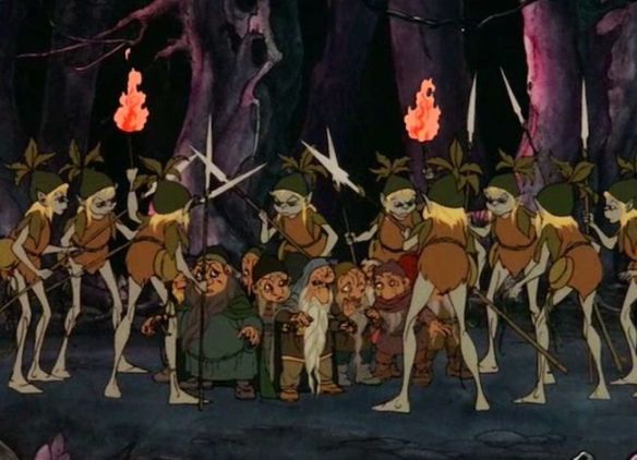 I like to paint my Old World elves in colorful skin tones. I like the folklore tradition of elves being more supernatural beings and not just humans with pointy ears. Their stats certainly lend support to them having otherworldly origins. So, my Dark Elves are light blue in the classic ‘night elf’ style of the 80’s. My High Elves are all white like Elric of Melnibone. The Wood Elves? As I wrote about in the Halfling team post, I’m a big fan of the Rankin Bass Tolkien cartoons, so they’re a grey/green hue with bright yellow hair as seen above in the still from The Hobbit. Those are the wood elves surrounding the party of dwarves.