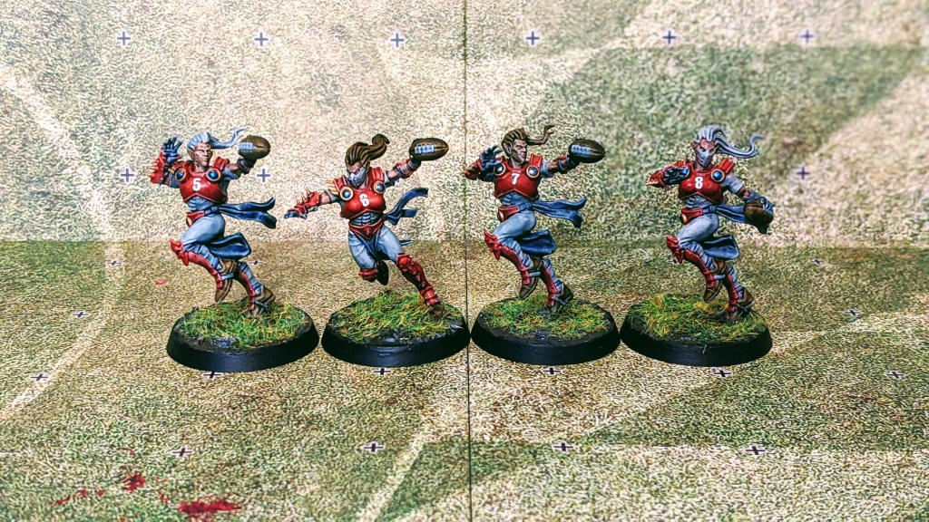 Next are the real star players of the elven union team, the catchers. I had the most fun converting these models to get some variety, including two female variants. It’s pretty easy to use the female torsos on the male bodies (not as easy the other way around I found). One of the female catchers is built on the same catcher body, but the other is based on a lineman pose. I like that it gives the impression that she has caught the ball and already turned her head looking for her next move and failed dodge roll.