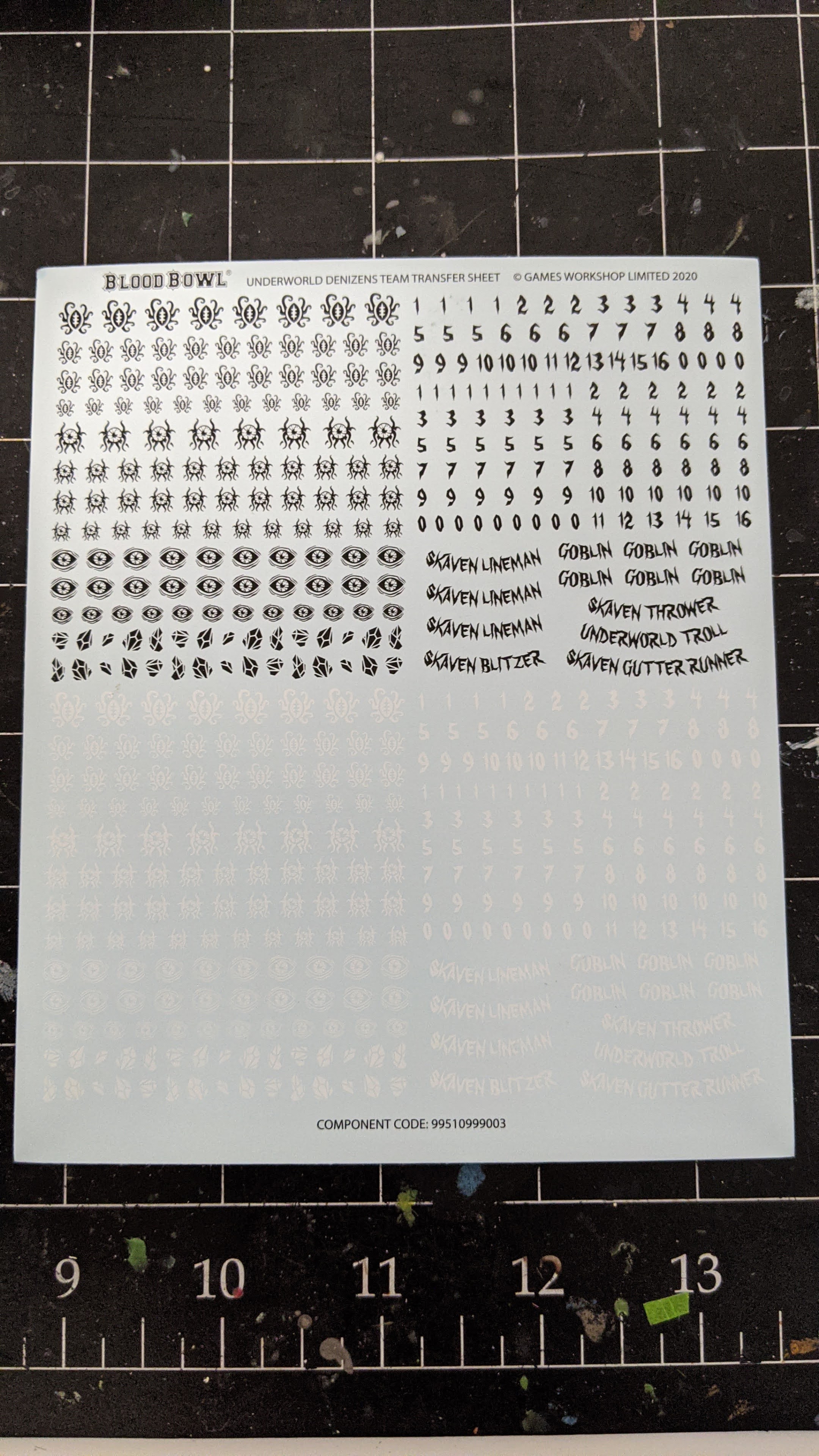I’m not sure if you’ve noticed, but both the underworld denizens and old world alliance boxes have disappeared from the Games Workshop website. It’s possible they’ll come back with newly printed team rosters inside them like the rest of the teams, but I got worried they will be gone forever. Now, there’s nothing unique about the underworld denizens box, it’s just one sprue of skaven and one sprue of goblins, no new models here, but it does include a new set of transfers. As much as I hate applying transfers, I really really like the transfers for the underworld team. The typeface for the numbers is great and I love all the little symbols.