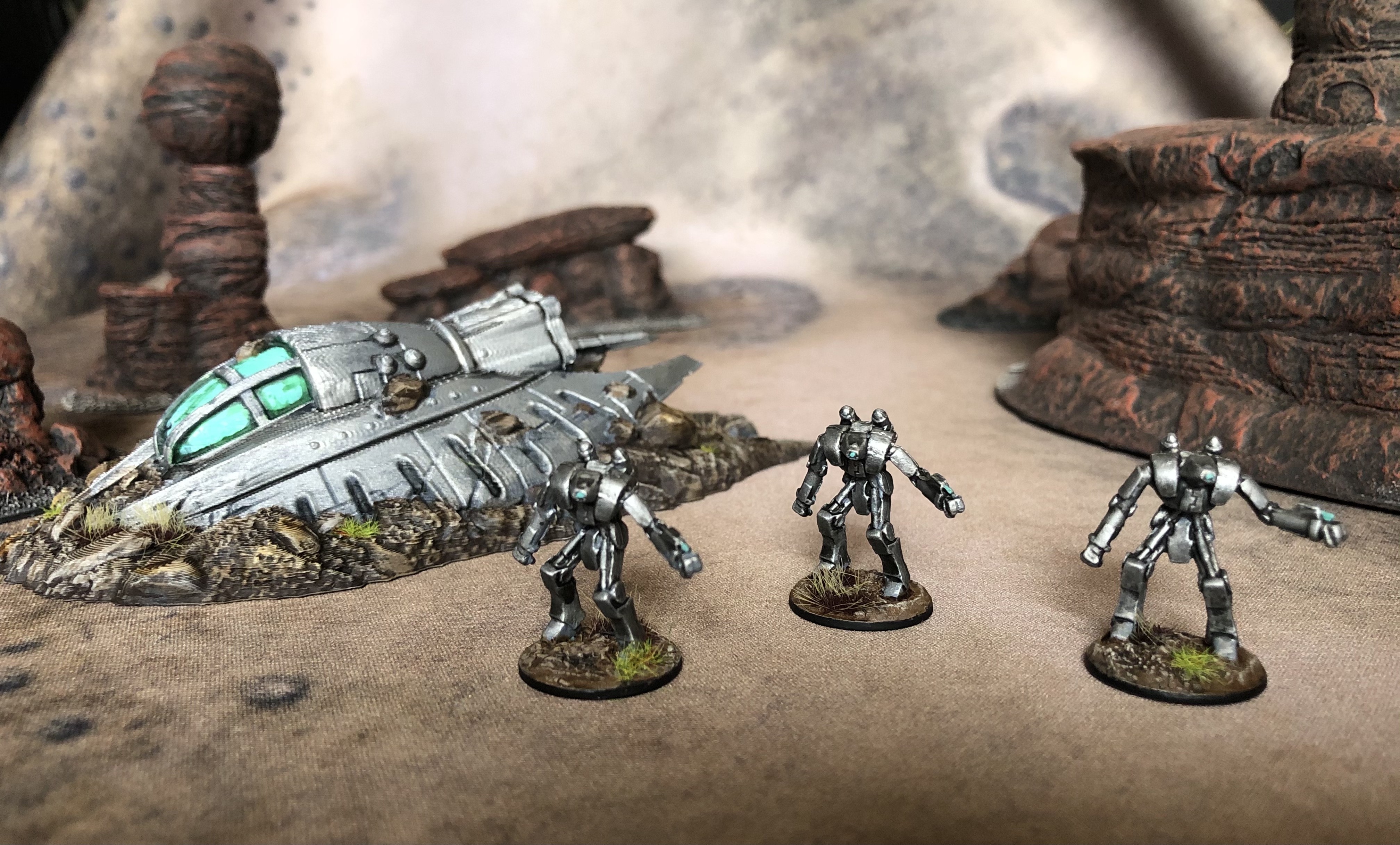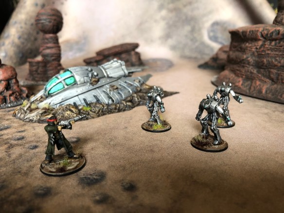 First, we have the crew of the crashed UFOs. Each time I game this setting, I’ll put a crashed UFO somewhere on the table. It’s existence is what creates the area of interest. The model was a 3D print I bought off Etsy for 20mm scale. It’s got a lot of those 3D printing lines on it that I’m not too excited about. It looks fine on the ship, but not so good on the kicked up dirt and soil. The aliens are 15mm models from Rebel minis. I contemplated going green for better contrast with the table, but this being set in the 90s…Greys were all the rage. Alien Autopsy anyone? I’ll use these models as ‘Bandit’ hostiles on the ZA hostile chart.