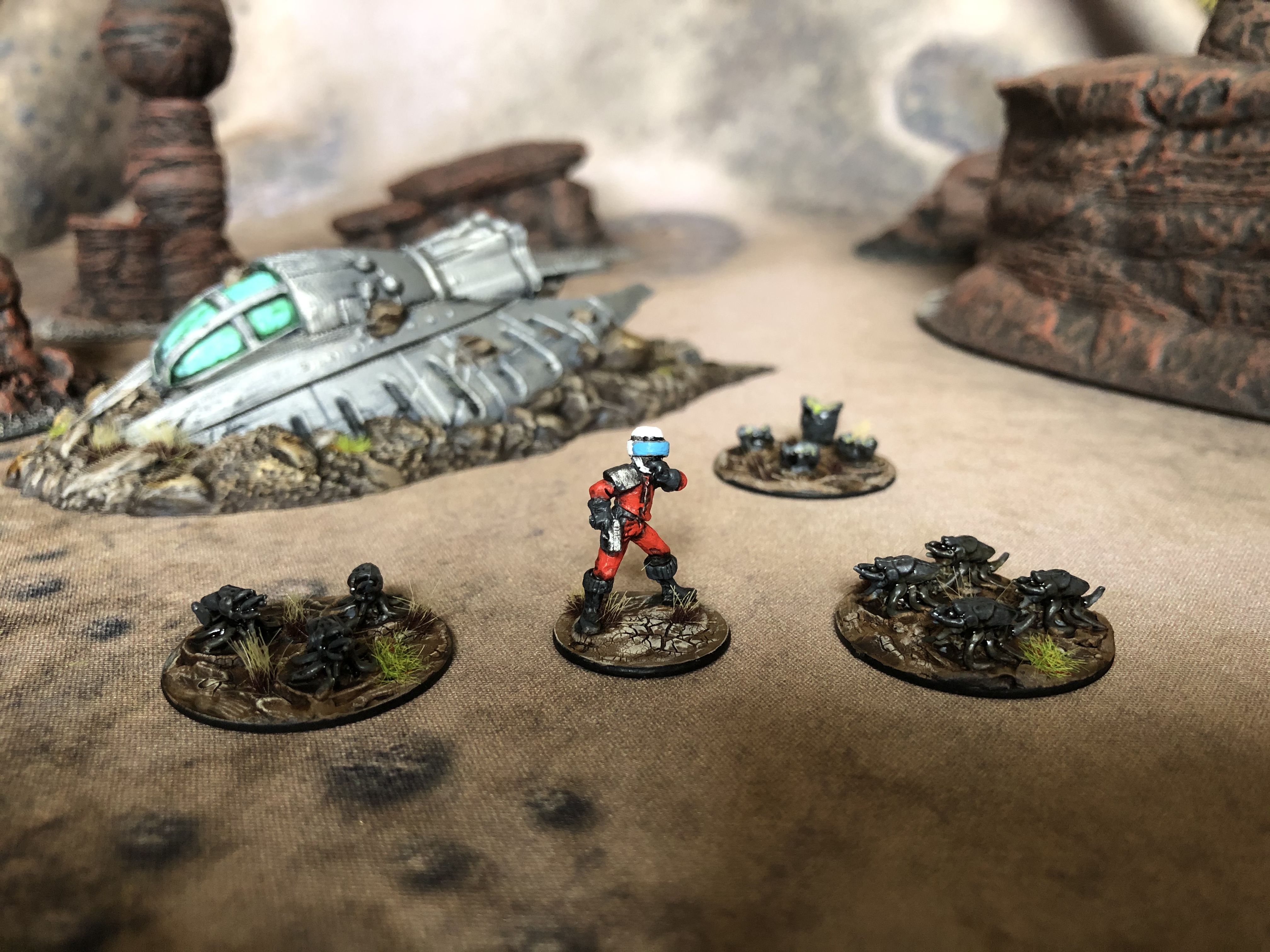I’ll post more detail on these gangs in the future. Currently, I’m tackling this project with terrain, objectives, and hostiles first. Oh, a little more on this setting. Living in Texas, I’ve fallen in love with the American Southwest, and New Mexico’s Roswell is the perfect place to set a fictional exclusion zone. The timeline of the setting is similar to Gaslands, but with a few small additions. Essentially, that wasn’t a weather balloon in 1947, but an actual crashed alien craft. Reverse engineering that is what enabled earthlings to develop travel to Mars per the Gaslands background. 50 years later, a large scout fleet came to find the fate of that first ship, but with a War of the Worlds type illness befalling the aliens, they all crashed in and around Roswell. Currently, there are many crash sites around Roswell emitting gases, space spores, alien chemicals, etc. There are also creatures in the area spawned from these fumes or survivors from the wreckage. With the Y2K bug looming in the near future, earthlings are scrambling to get off planet to Mars before all technology crashes, and they’re stuck on a dying Earth forever. This is Roswell ’98.