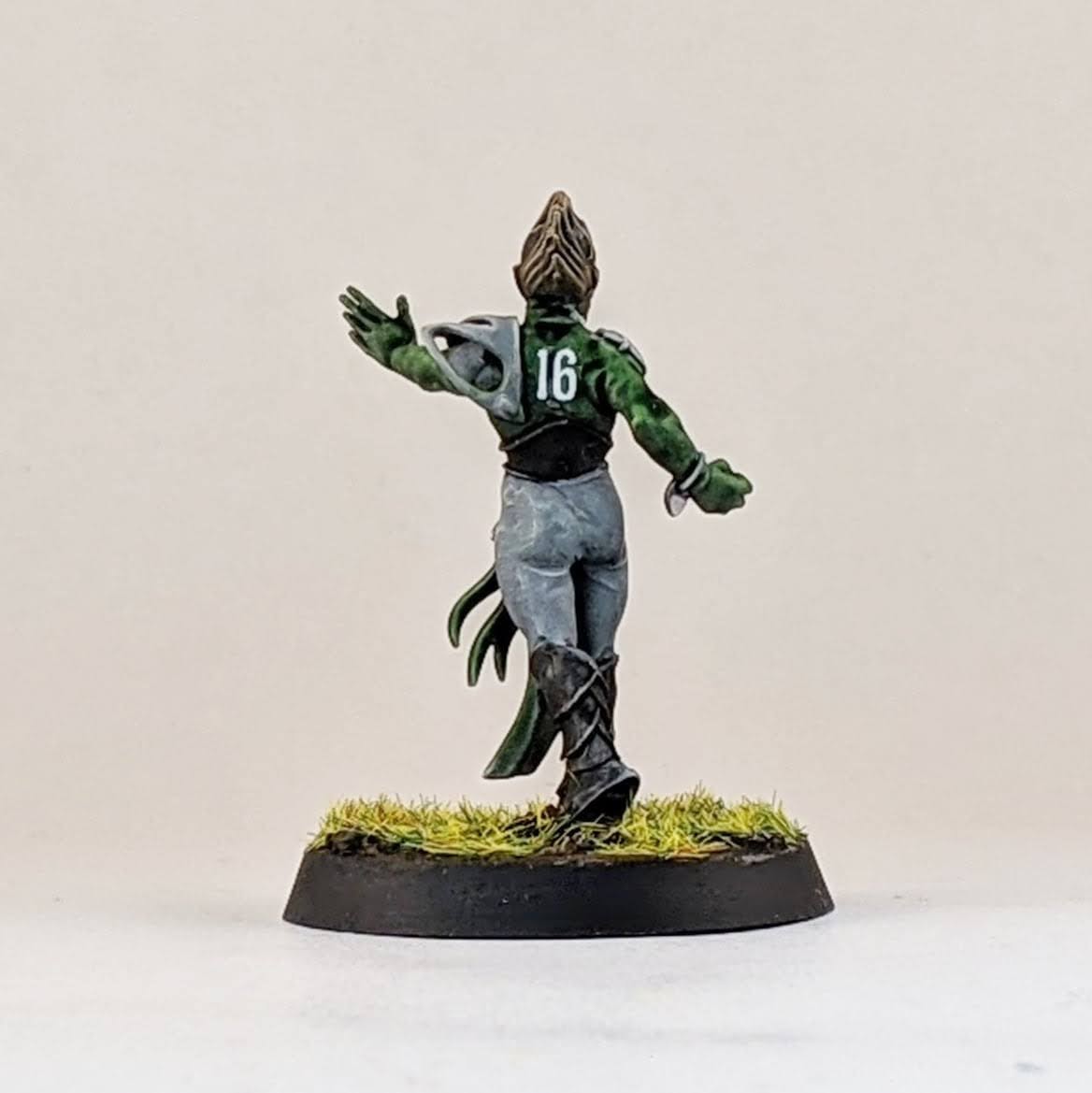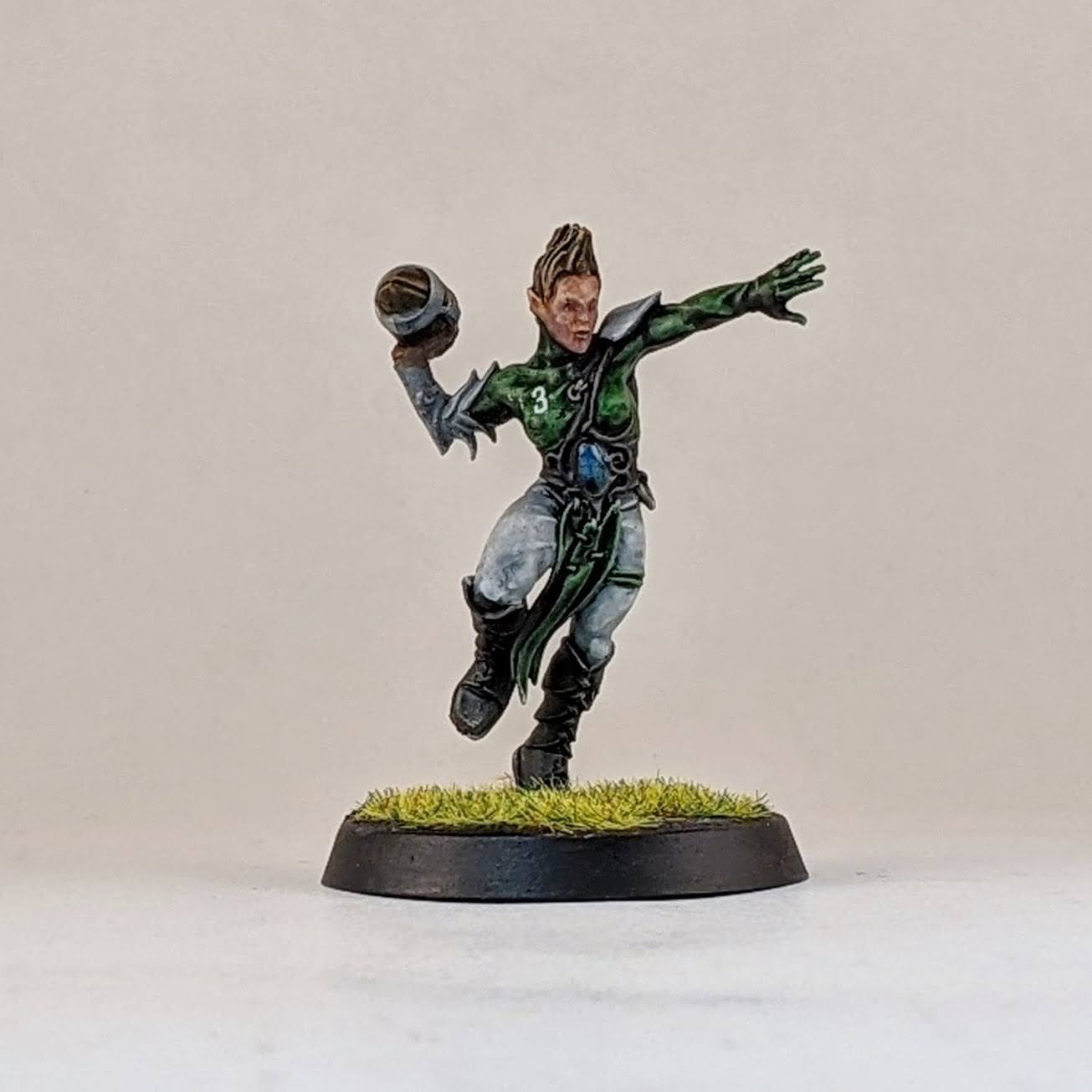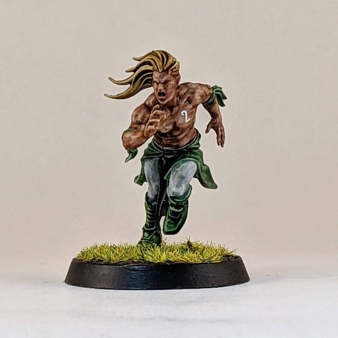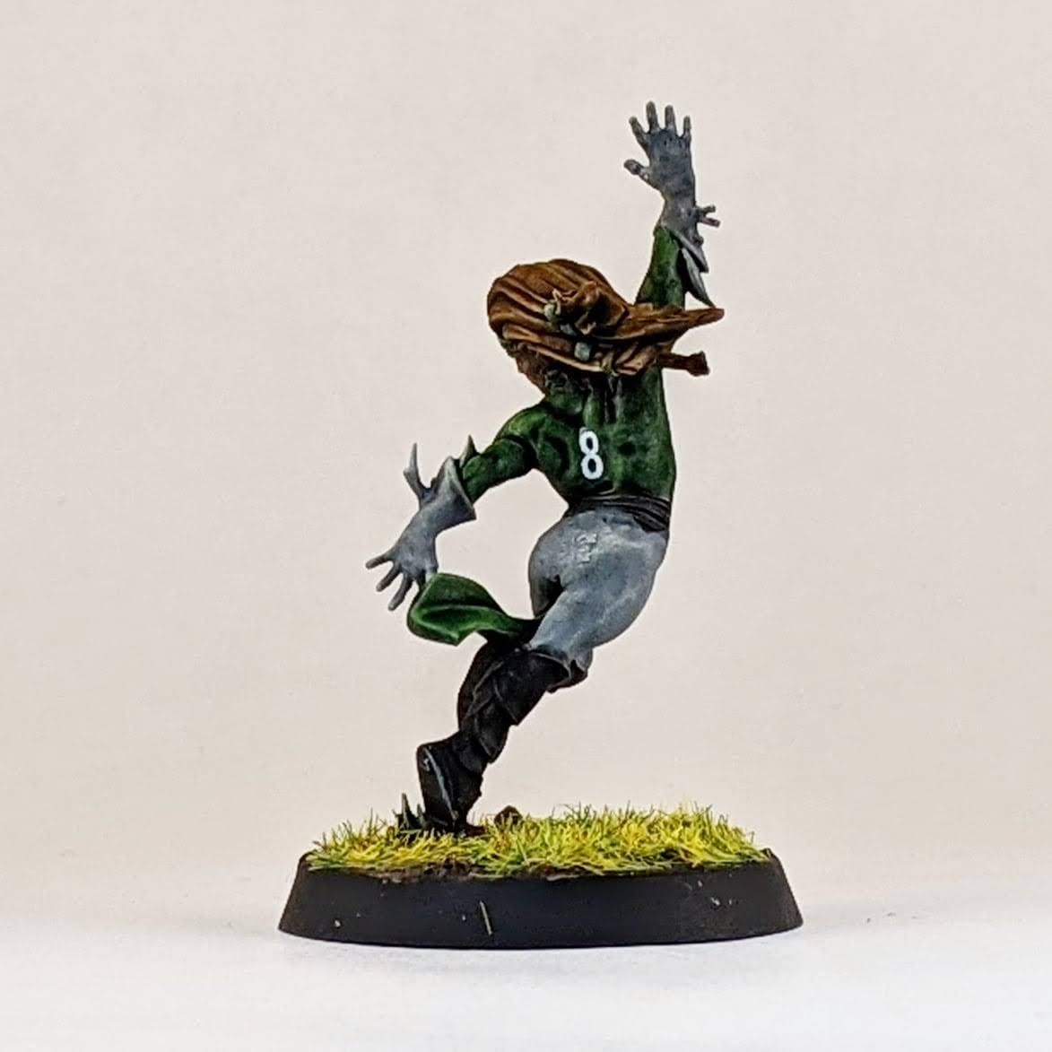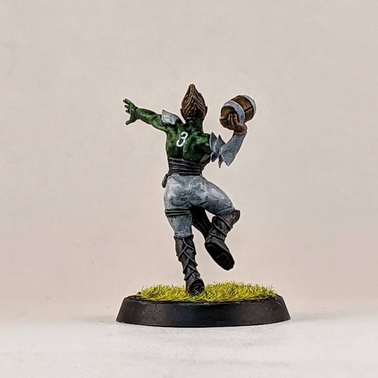 And finally another star player conversion. Ever since Warhammer Underworlds: Beastgrave came out, I thought this model could make for a wood elf star player conversion. I trimmed him away from his scenic base and swapped his sword for the hand from a thrower. I know models holding footballs is a hot topic, but I don’t mind personally and I think it helps to distinguish Blood Bowl players from other fantasy warrior miniatures, especially in the case of conversions. I glued his hoof to a spare human player helmet (again the color of the helmet hinting at my future Old World Alliance team). Then I glued the helmet to the base, allowing for a sturdier connection point for the model. I love the pose that this model has, almost like he’s showboating as he scores another touchdown mixed with a Gladiator “are you not entertained?!” pose. I don’t have a specific star player in mind for this model, so I suppose it could be used for any of them really. I guess he would make for a good Dolfar Longstride but I’ve always associated that character more with high elf teams than wood elf teams. He could be a fresh take on Jordell Freshbreeze I suppose.