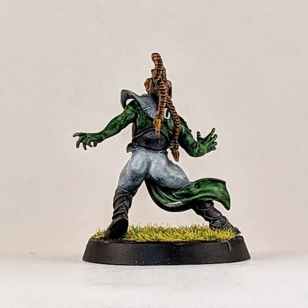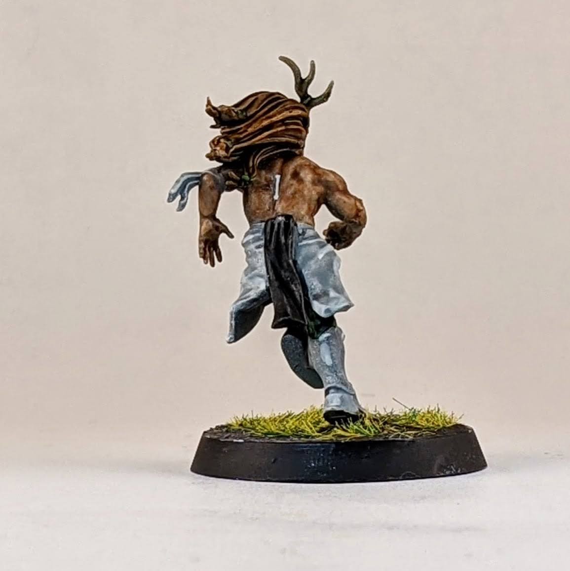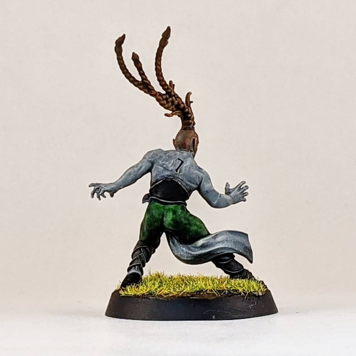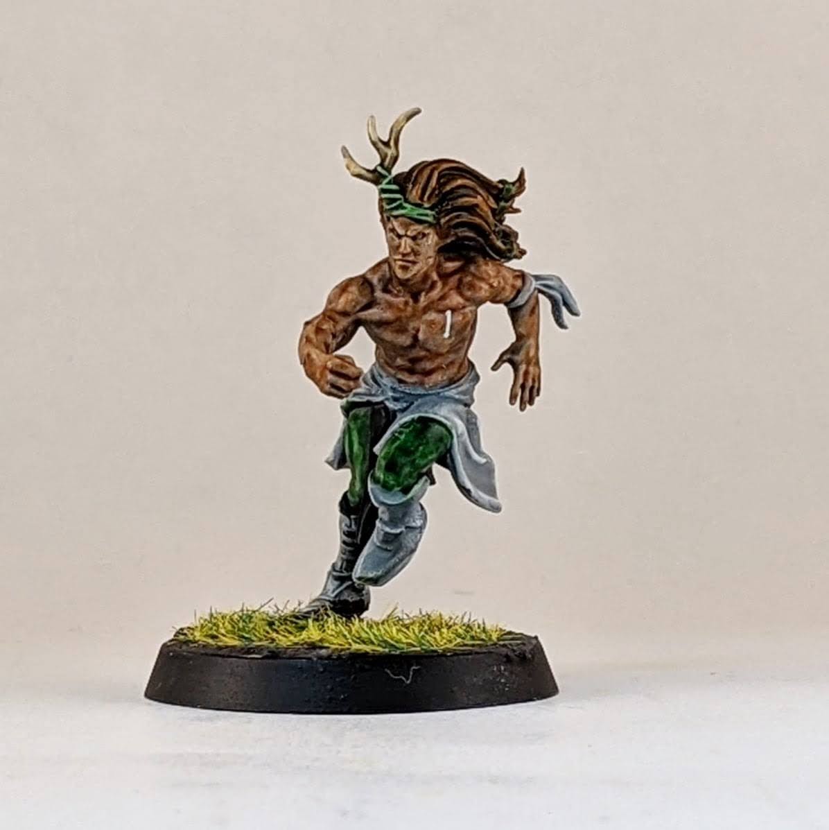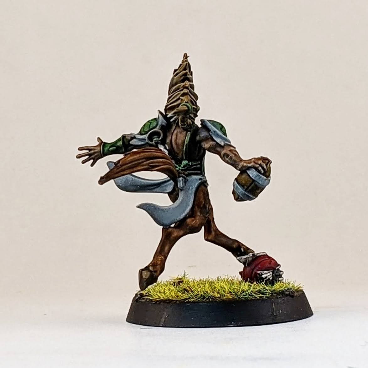And finally another star player conversion. Ever since Warhammer Underworlds: Beastgrave came out, I thought this model could make for a wood elf star player conversion. I trimmed him away from his scenic base and swapped his sword for the hand from a thrower. I know models holding footballs is a hot topic, but I don’t mind personally and I think it helps to distinguish Blood Bowl players from other fantasy warrior miniatures, especially in the case of conversions. I glued his hoof to a spare human player helmet (again the color of the helmet hinting at my future Old World Alliance team). Then I glued the helmet to the base, allowing for a sturdier connection point for the model. I love the pose that this model has, almost like he’s showboating as he scores another touchdown mixed with a Gladiator “are you not entertained?!” pose. I don’t have a specific star player in mind for this model, so I suppose it could be used for any of them really. I guess he would make for a good Dolfar Longstride but I’ve always associated that character more with high elf teams than wood elf teams. He could be a fresh take on Jordell Freshbreeze I suppose.