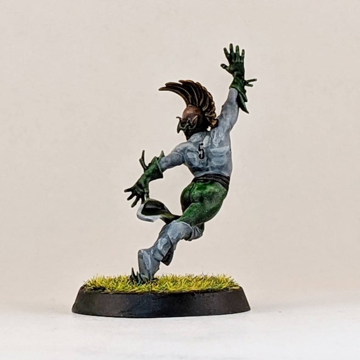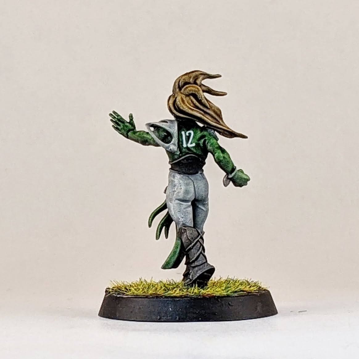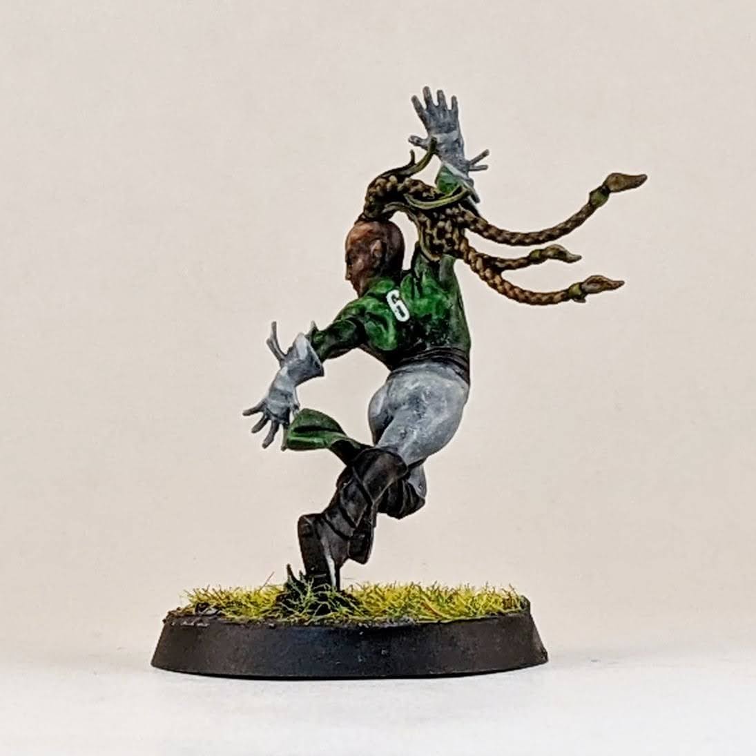 I also made a Willow Rosebark conversion. I’m lukewarm on the Forge World model, it’s ok, but it doesn’t look like the concept art in the BB16 books or this character. For my conversion I used the body of an Age of Sigmar dryad with the addition of Blood Bowl wood elf arms, I think one is from a wardancer and the other is from a lineman. I also included a shoulder pad and a facemask from the Blood Bowl kit to help tie her into my team and to stand out as a sports player and not a fantasy forest spirit.