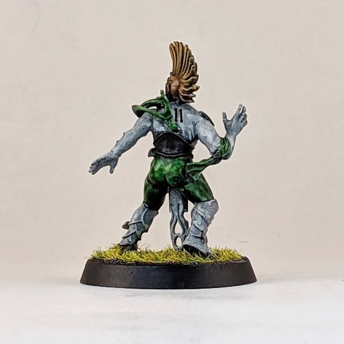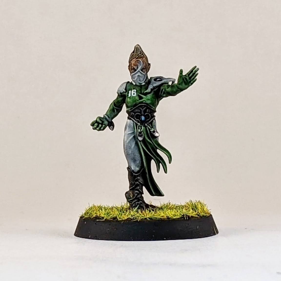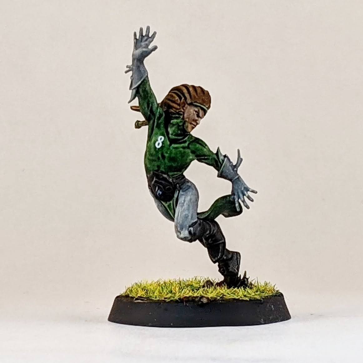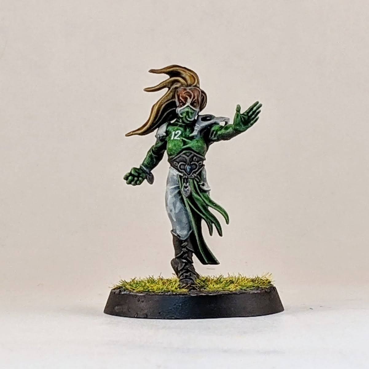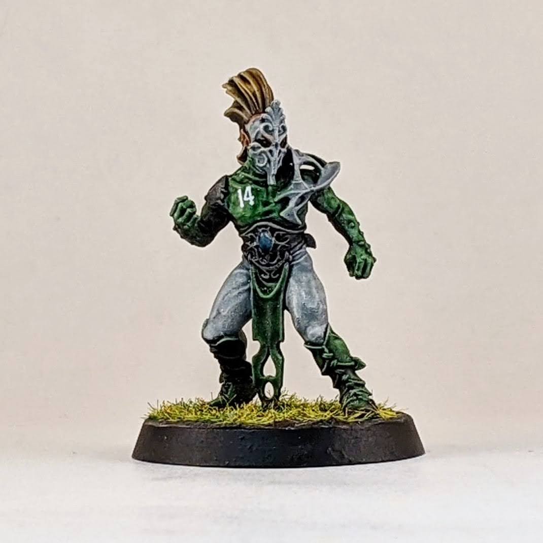 I’m not sure I’ll ever take four catchers on a wood elf roster, but I figured I may as well have the option. I decided to split a box of Athelorn Avengers with Mr. White giving me one catcher and options to convert a lineman into a catcher. The key difference between the catchers and linemen are their lack of shoulder pads, big belt buckle and their gloves. I selected the lineman body with the most catching pose and shaved off his little under shoulder pads and the connection points for the big shoulder pad. The belt buckle isn’t the same and he doesn’t have the gloves, but I hope it’s enough to distinguish him from the similarly posed linemen. It probably won’t ever be an issue as I stated above, using all four catchers at once is highly unlikely for me. I also used one of the catcher heads on the lineman body to help him stand out. And for the standard catcher pose, to avoid duplicate models with the other catchers, I used a spare wardancer head.